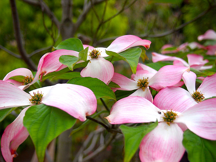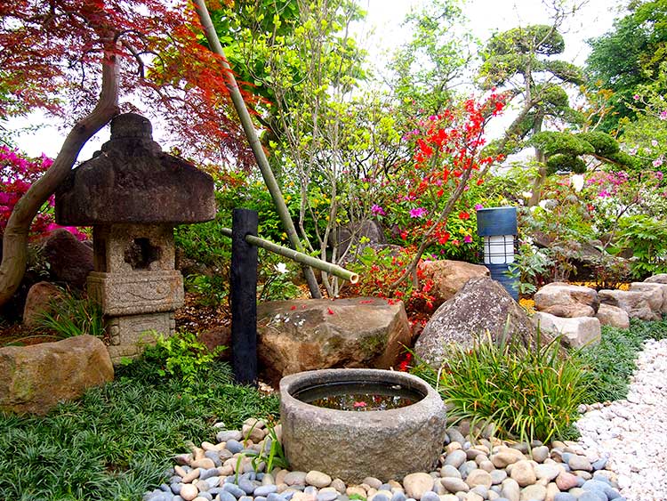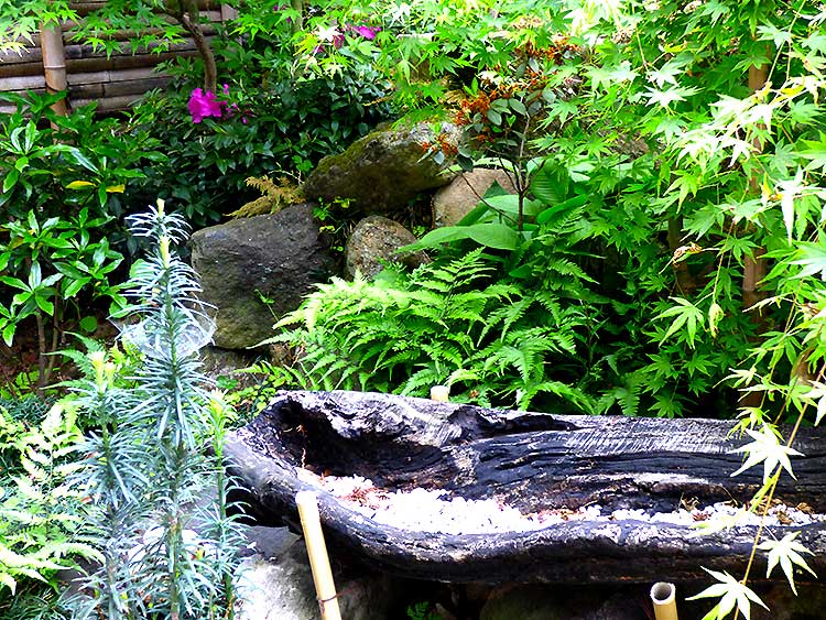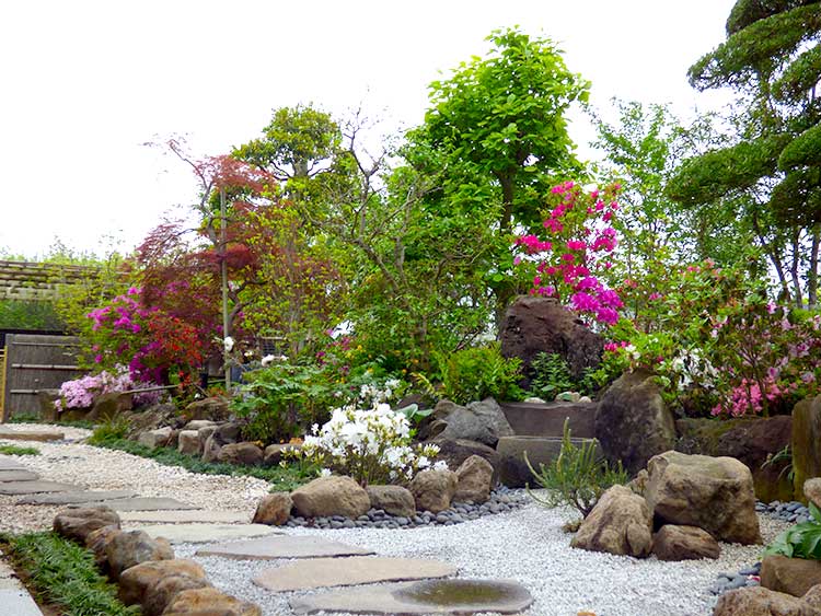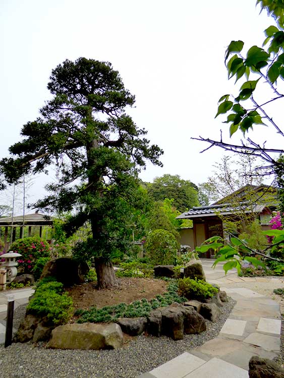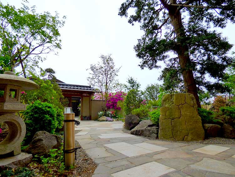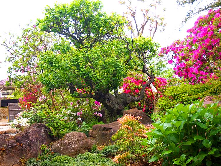 大ぶりのつつじが見事に咲き誇る優美な日本庭園のコーナー、大きな樹木の下には可憐な山野草があります。