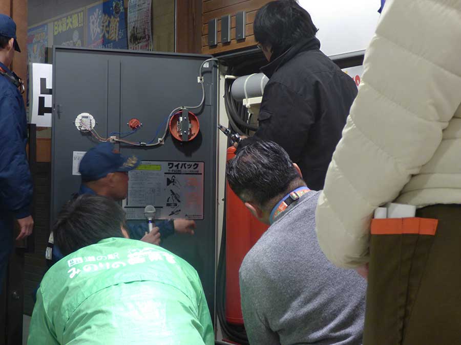 最後は、設置されている消火栓を確認しながらの講習指導です。質疑応答では、積極的に質問する場面が見られました。