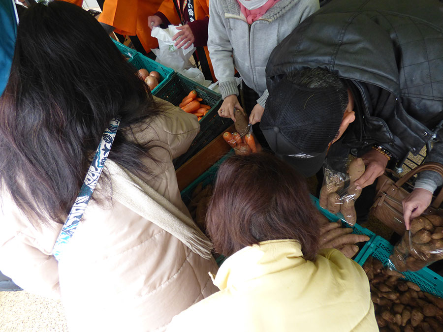 たまねぎ、にんじん、さといもなど、袋にギュ~ギュ~詰め込むのが楽しい!!!!大人の方もちびっ子も上手に袋からはみ出すほど!です。