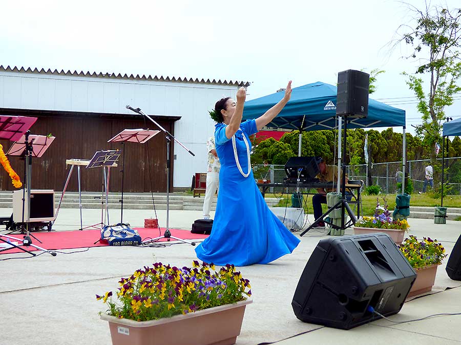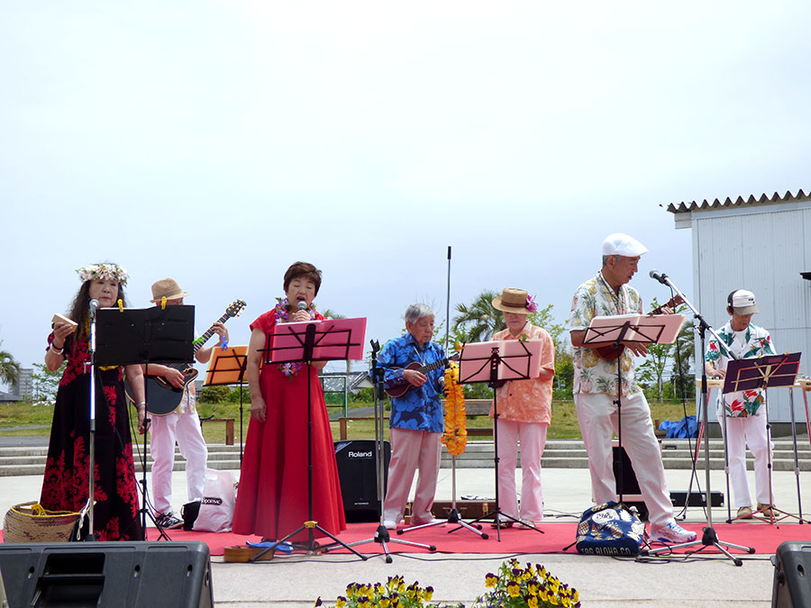 午前中はふれあい広場におきましてブルーレイアンサンブルさんのハワイアンの演奏。フラが華を添えていました。
