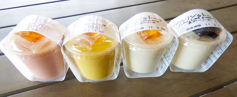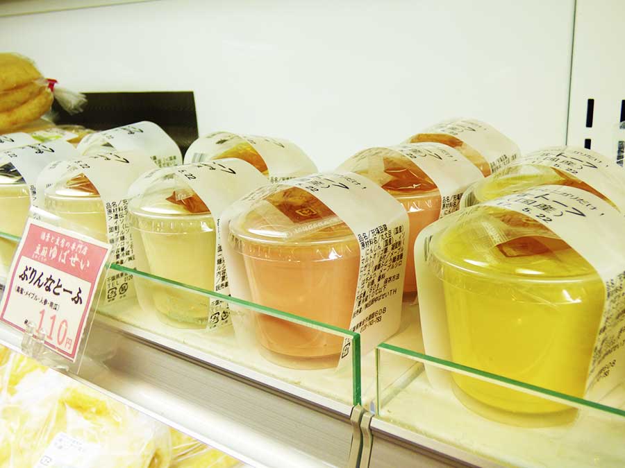 豆厨ゆばせいさんのプリンなトーフ(黒みつ・メープル・かぼちゃ・にんじん) 各110円(税込)