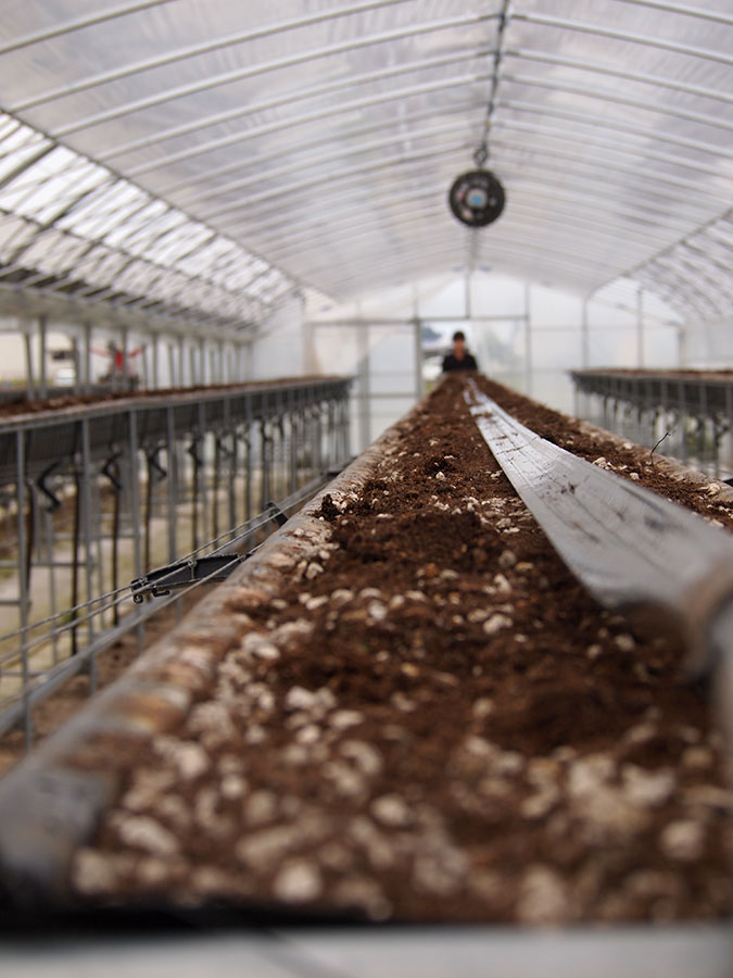 ピートモスを敷き、苗を植え付けていきます。黒い帯は水を通すパイプの役割をします。
