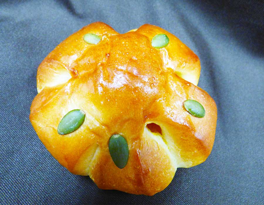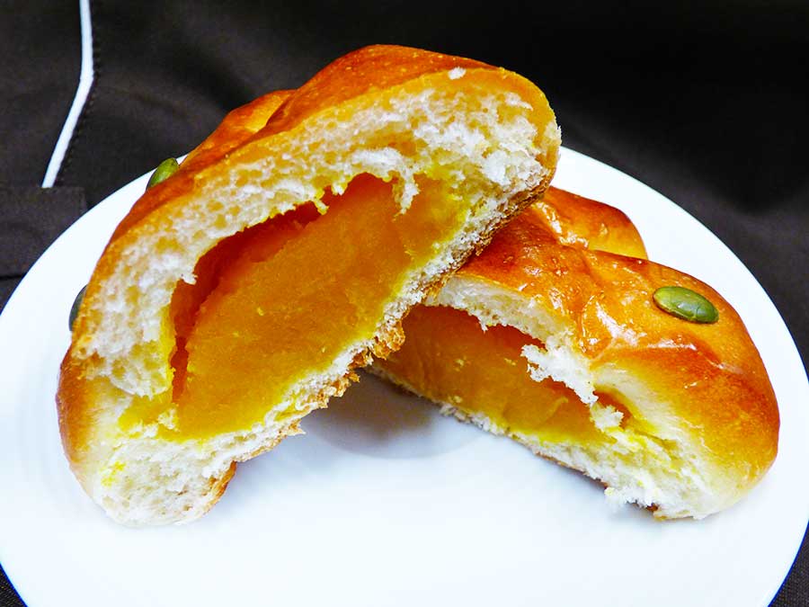 パンプキンシードでおめかししたパンの中には、鮮やかなオレンジ色のカボチャ餡がたっぷりと入っています。