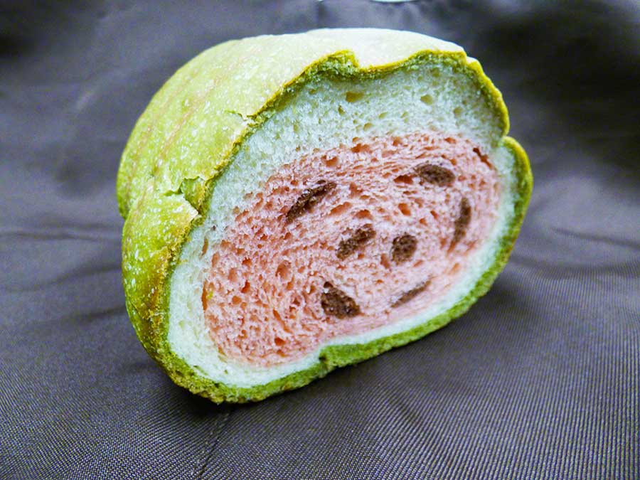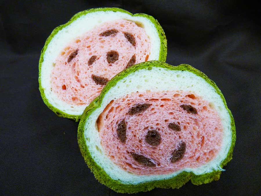 これからの季節にぴったりのスイカ柄が可愛いラウンドパン。果肉と皮の間の白い部分や表面の焼き目の縞模様がよりスイカらしくて細かい!