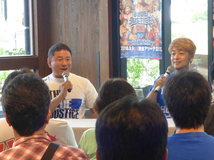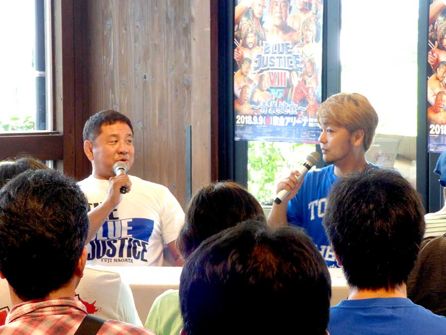 午前11:00〜の回では9月9日に行われる『千葉・東金アリーナ/永田裕志 50th Anniversary Road to DESTRUCTION BLUE JUSTICE VIII ~青義健在~』のタイトルについての裏話や試合への意気込みなど、ここでしか聞けないスペシャルトークを熱く語って頂きました。