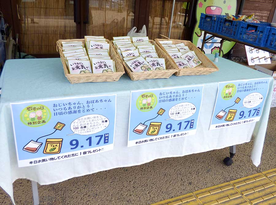 また、東金マルシェ入口付近では敬老の日 特別企画といたしまして全館全館でお買い物をしてくださったお客様先着100名様にお茶のティーバッグをプレゼントしております。