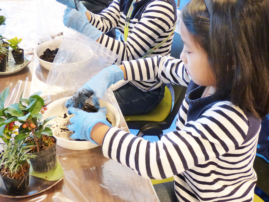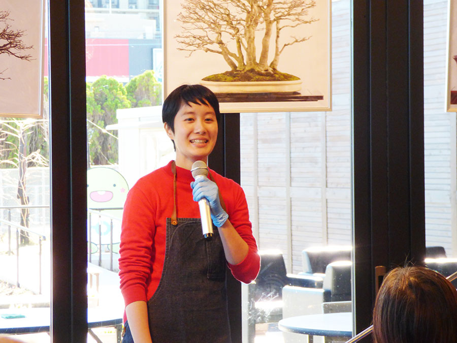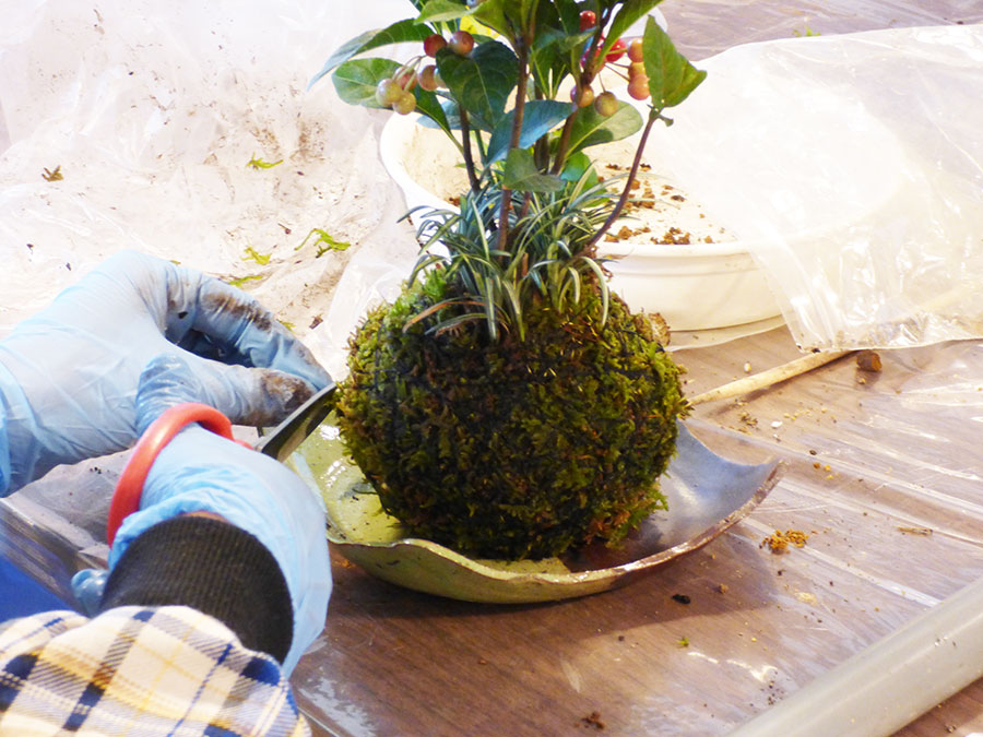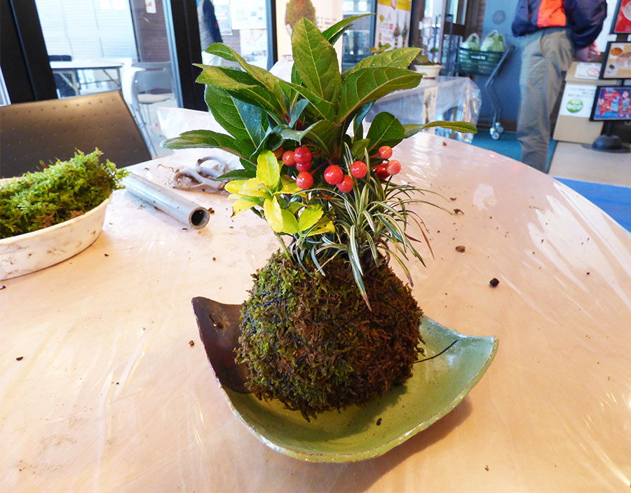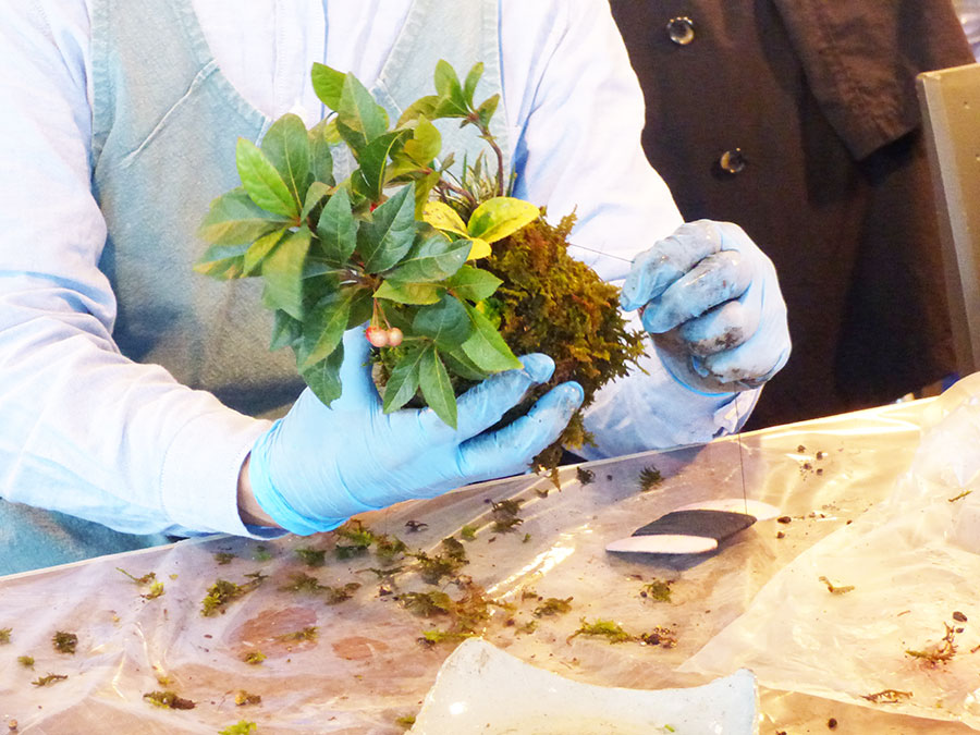 午前は情報発信コーナーにて講師に土屋桜子さんをお招きし、『苔玉づくりワークショップ』を開催しました。今回は、赤が美しいヤブコウジを中心とした華やかな苔玉を作りました。