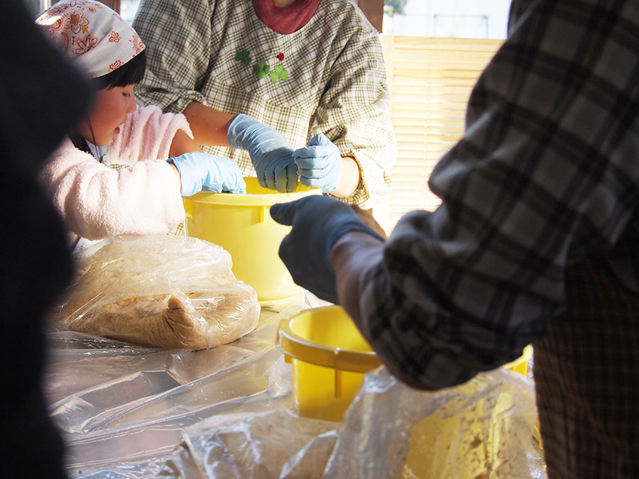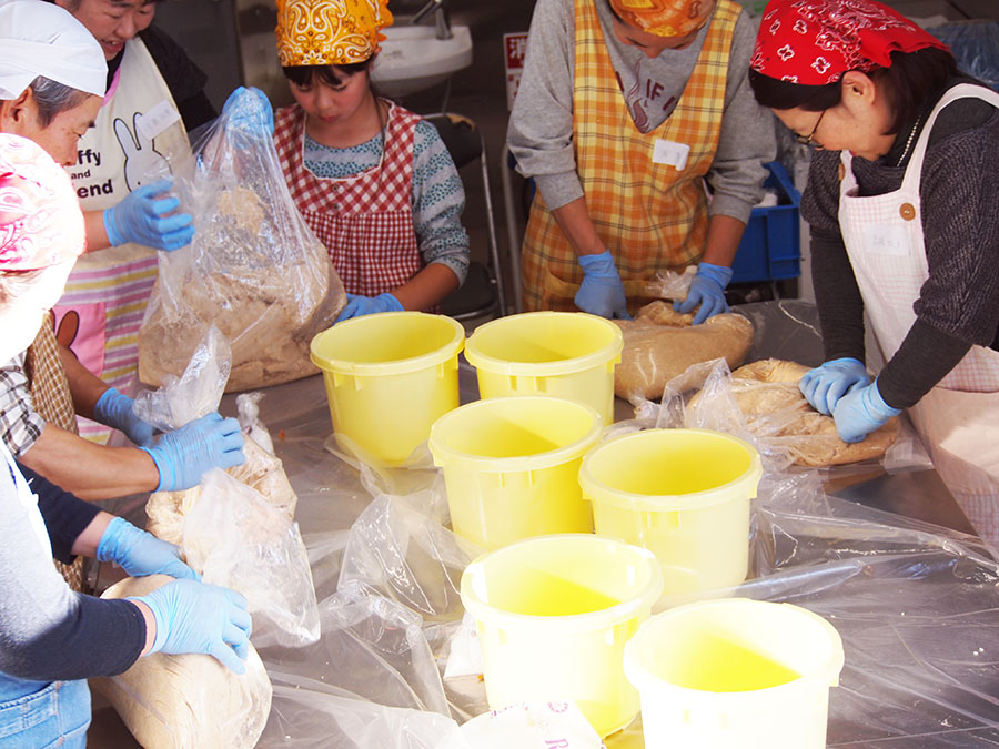 4kgの味噌を仕込むとあって煮大豆に麹を混ぜたり、こねたりと額に汗にじむ作業に皆さん一生懸命でした。