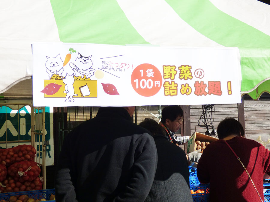 ただいま、東金マルシェ入口におきまして1回 100円でお野菜の詰め放題を行っております!