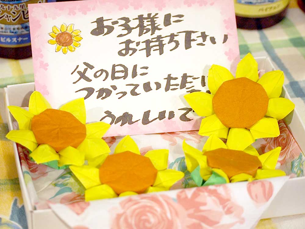 折り紙で作った「ひまわりモチーフ」を特別数量限定でプレゼントしておりますので、ぜひギフトラッピングにご利用くださいませ。