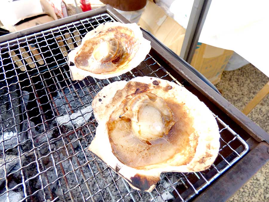 東金マルシェエントランス広場では、ジューシーなホタテ焼きや、東金産の茹でたてモッチモチの米粉麺大試食会などを行なっております!