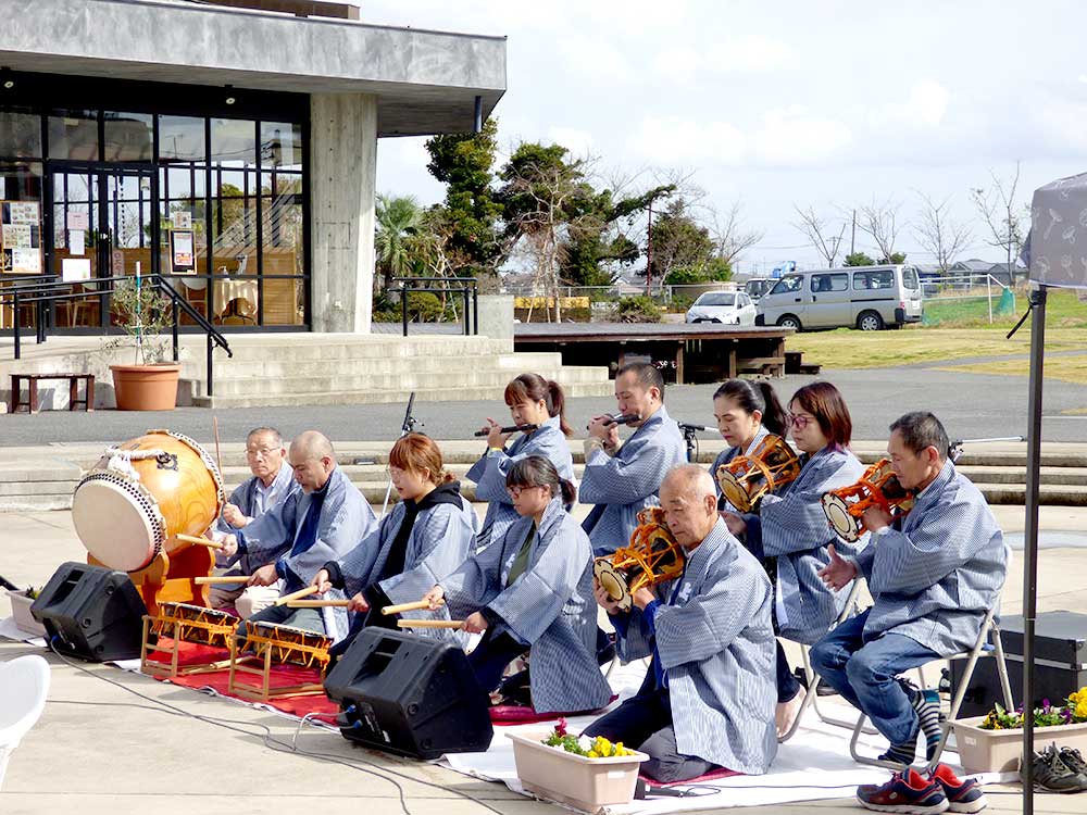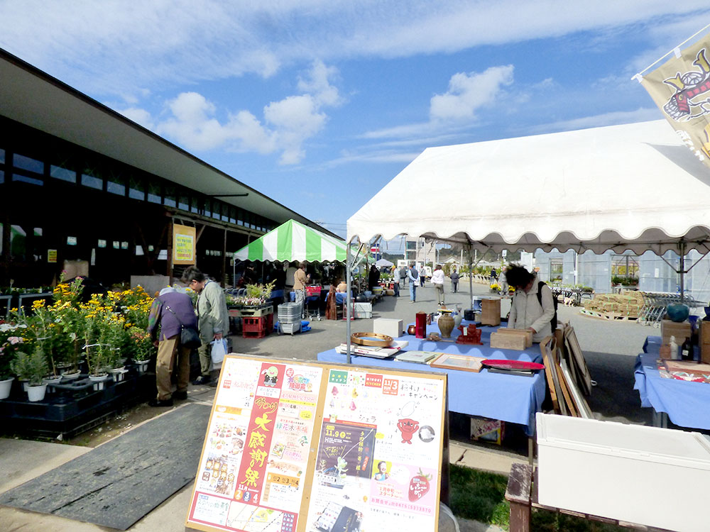 今日は出荷者さんの出店も増えて、にぎやかさを増しています!骨董品即売会はいつもながらの人気ぶり。「みのりステージ」では、青と会の皆さんによる東金市の無形文化財「東金ばやし」の演奏が行われています。