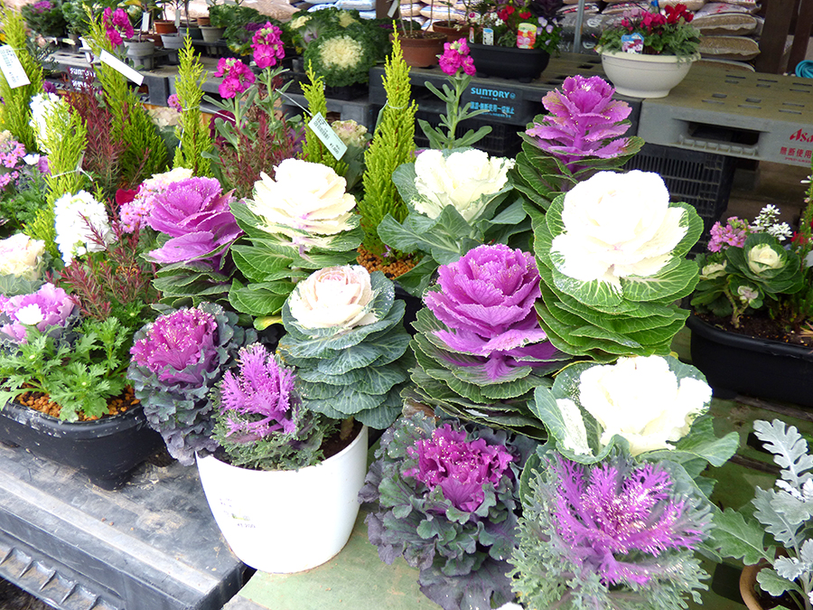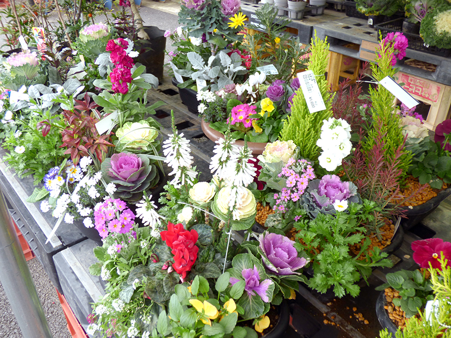 その他にもパイプハウス向かいの特設売り場では、お正月にぴったりの華やかな寄せ植えをご用意しておりますので、ぜひご覧ください。