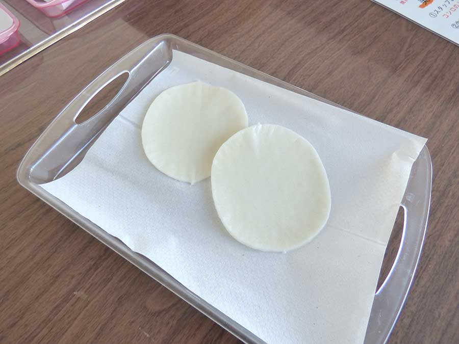 東金産コシヒカリを使用した真っ白い生地をクッキングヒーターにのせて、こんがりキツネ色になるまで焼きます。