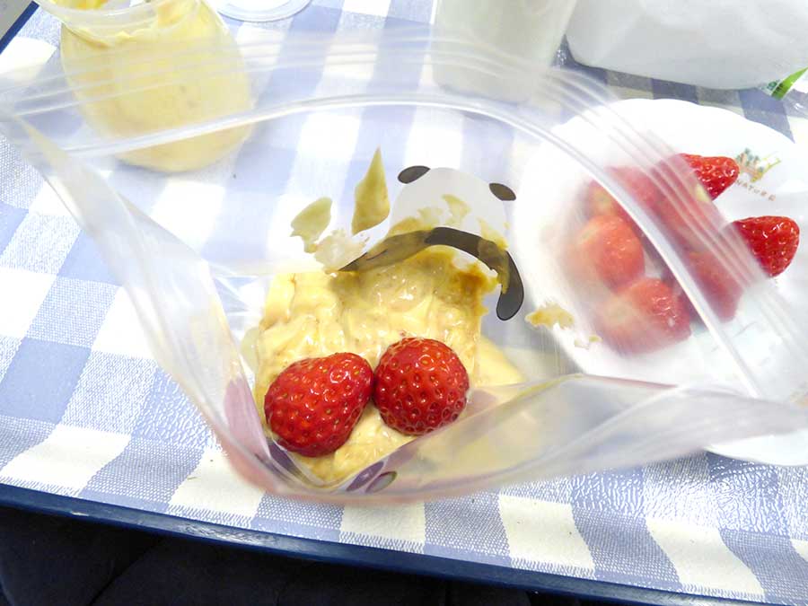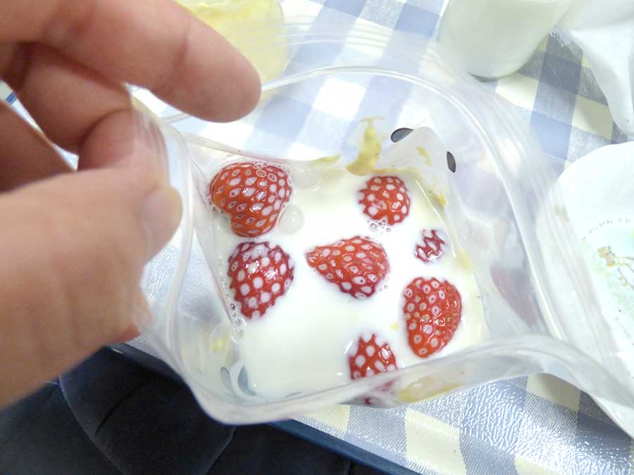 (今回は、旬なのでいちごを入れてみました!)しっかり混ざったら完成!