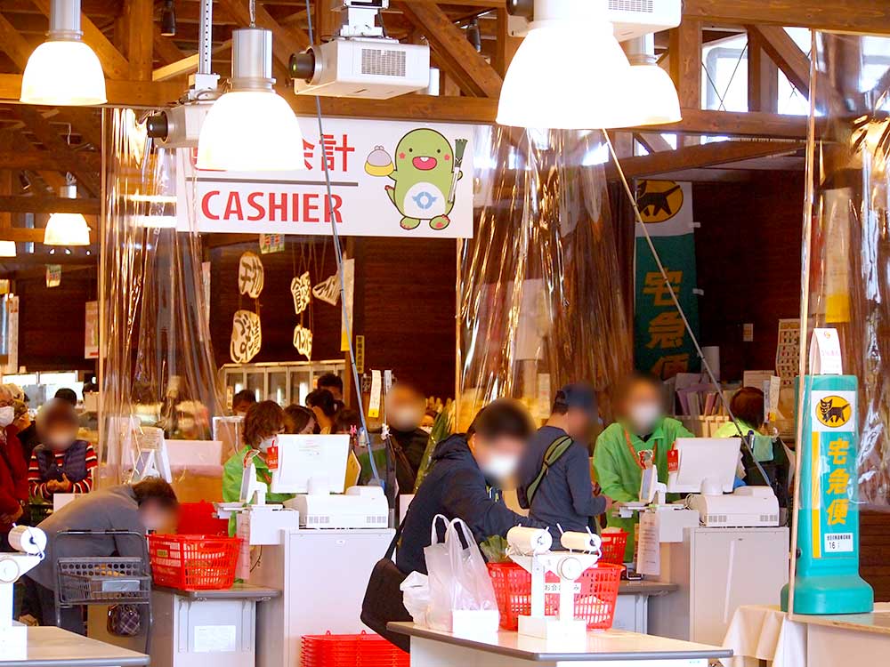 東金マルシェでは、3密を避け、感染防止のため、窓全開!にし、レジは飛沫感染防止のためこのようにシート越しでのレジ対応をさせていただいております。
