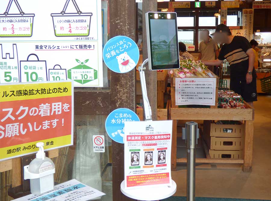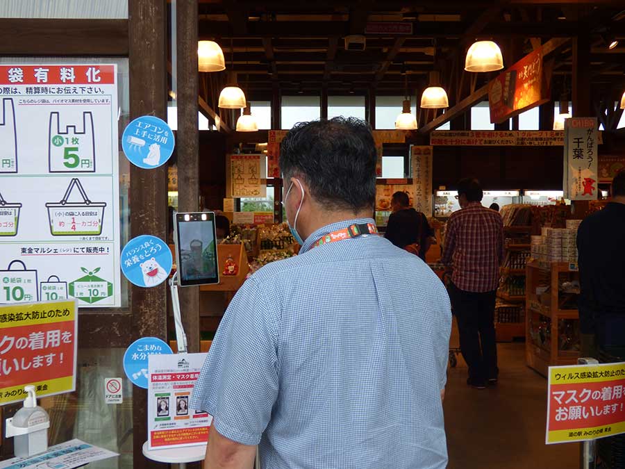 道の駅 みのりの郷 東金 東金マルシェの入り口に非接触検温AIカメラが設置されました。