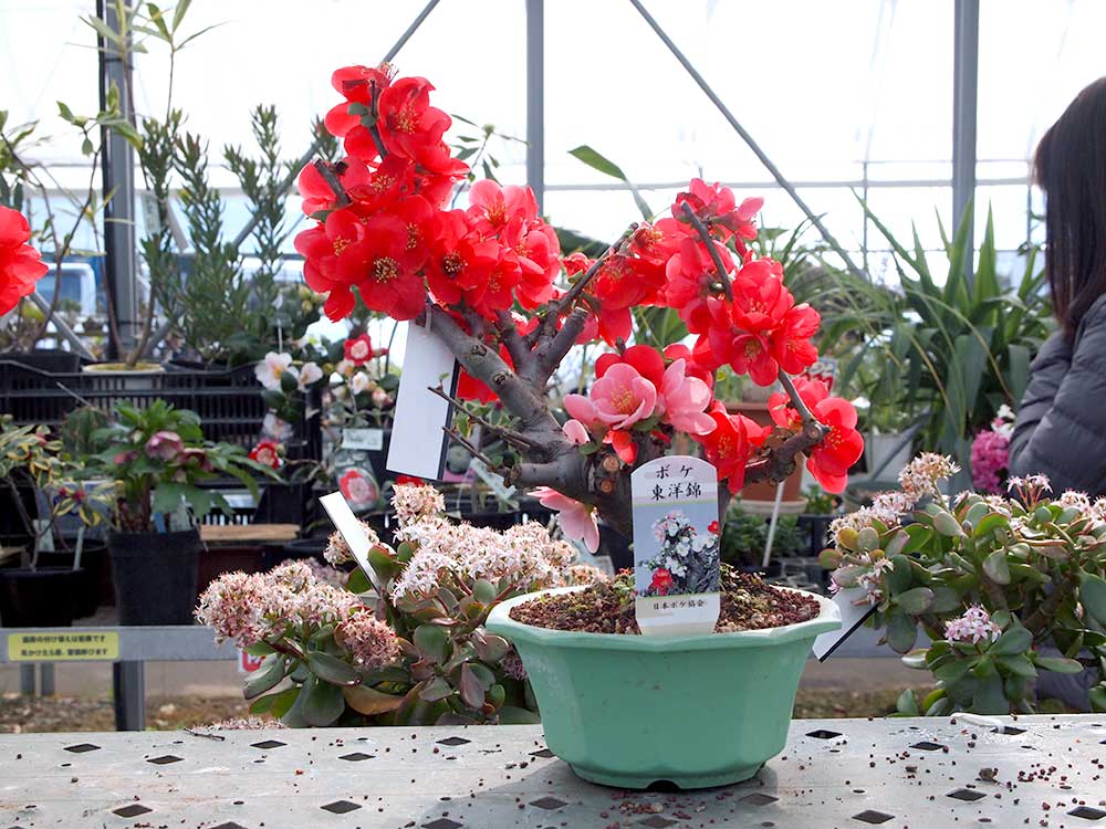 先日ご紹介をさせていただいた木瓜の盆栽の花が満開で、小さい鉢ですがすごくボリュームがあります。