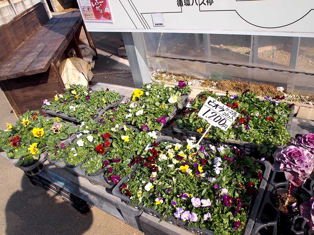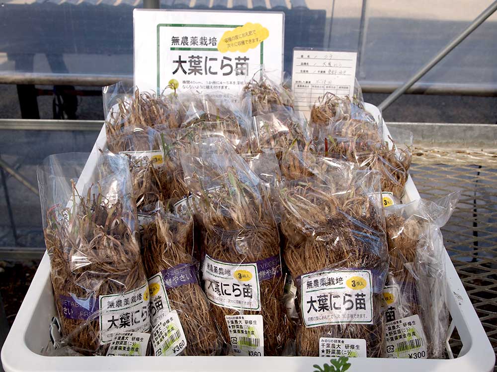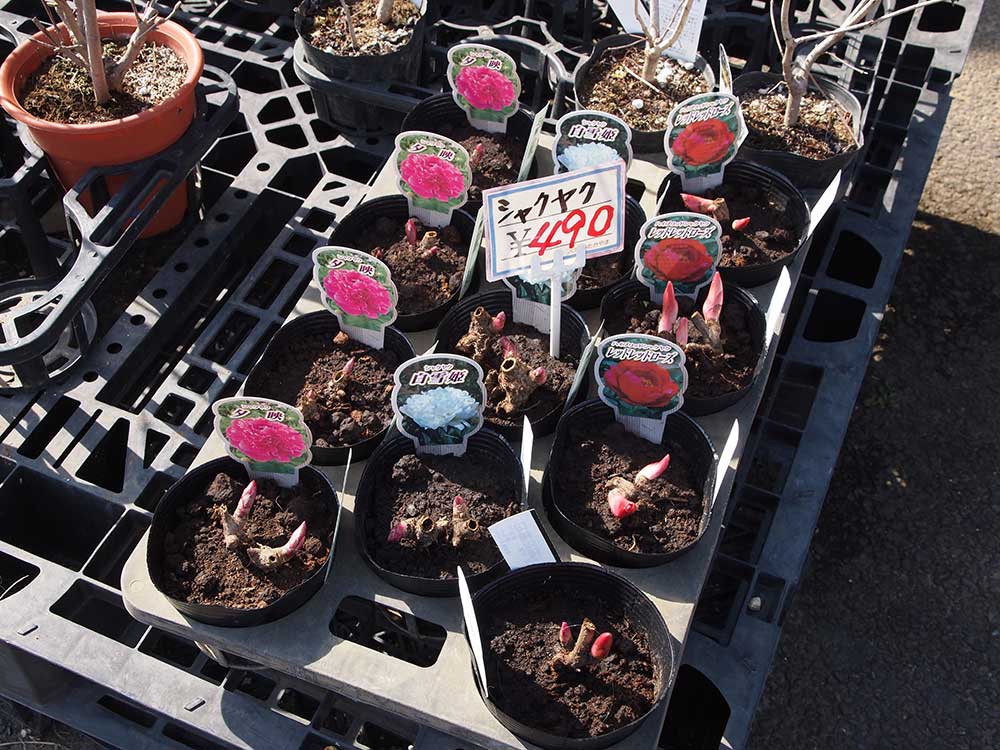 お得なビオラの苗セット、シャクヤクの球根、パイプハウスの中ですが「大葉ニラ苗」(千葉県立農業大学校の研修生さんの出荷物)があり、なかなか面白いです。