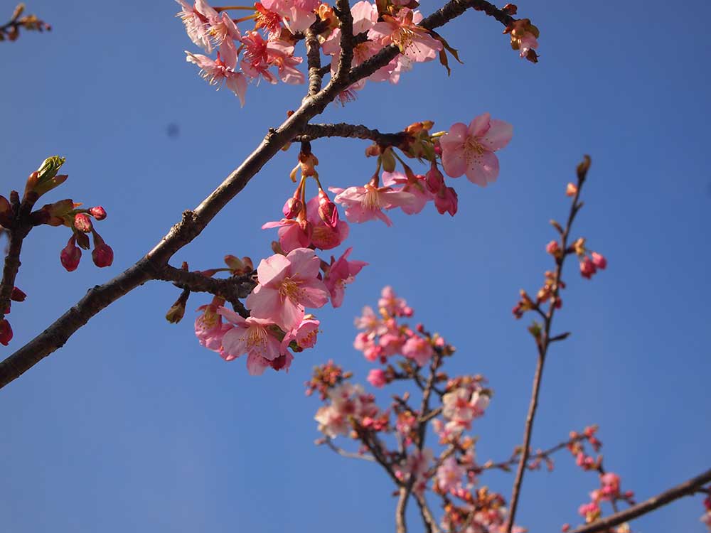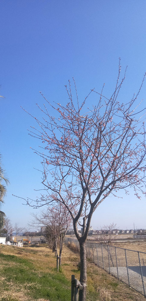 加工場に並ぶところ、フェンスのあたりにある河津桜が咲き始めました。