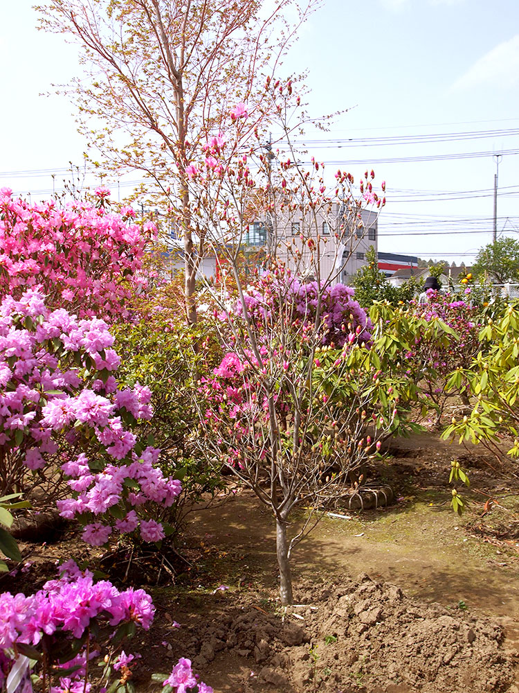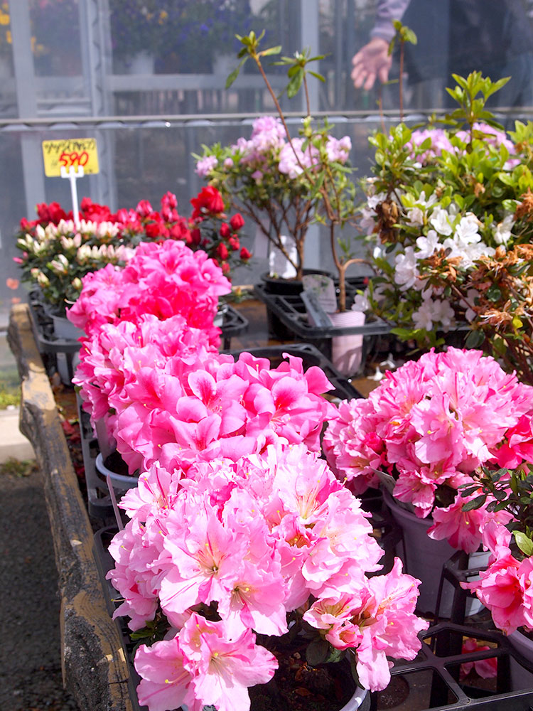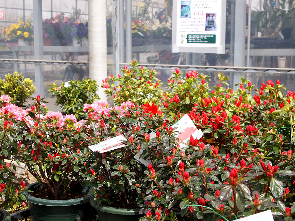 パイプハウス付近では、お手頃なシャクナゲ・つつじのお手頃な鉢苗が美しい色どりを魅せています。