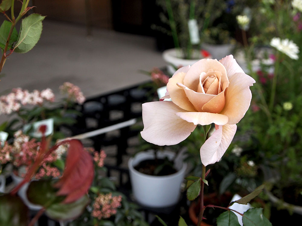 レストランへ向かう通路では、バラが咲き、鉢植えのツツジが満開になっている様子をご覧いただけます。