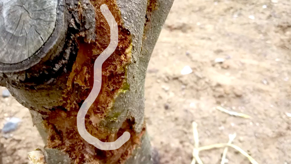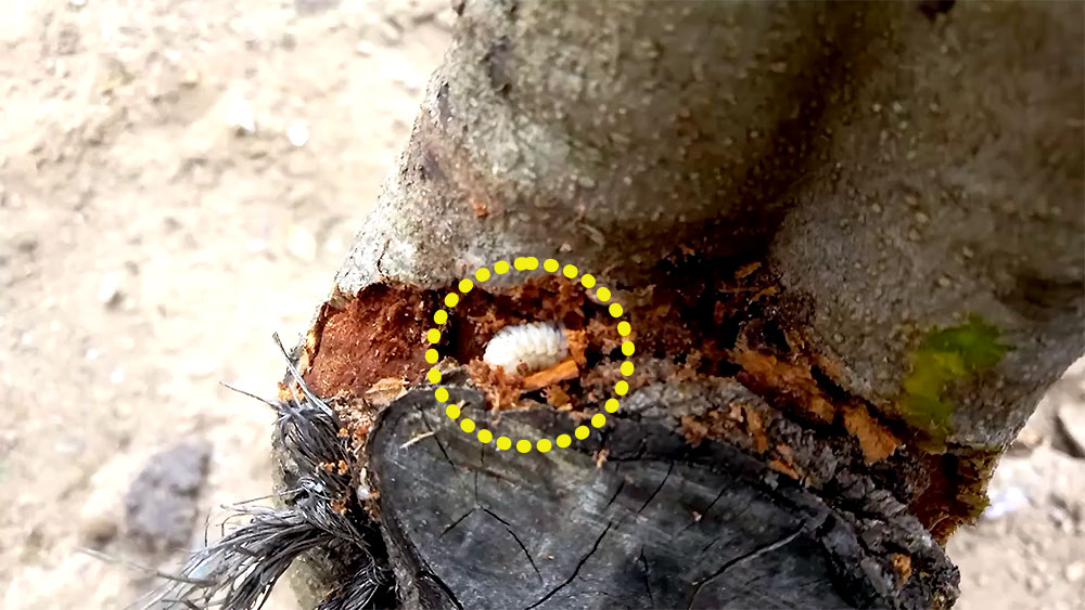 幹に穴が開いているところから木くずが出ており、ハサミの先で掘り起こしていくとゆりかごに入ったような白い幼虫が!