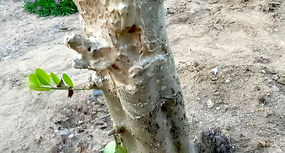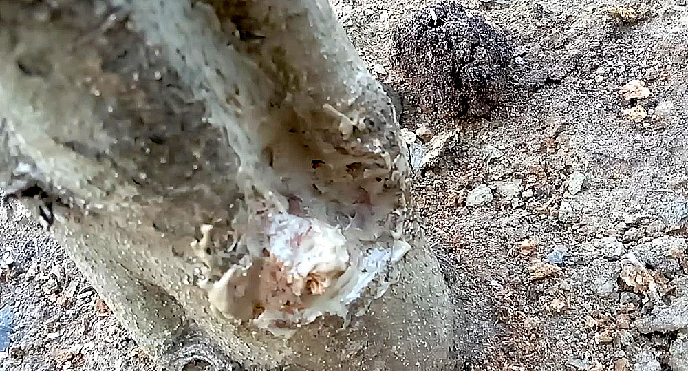 木の皮はホロホロになっており、生きている幹は白に近い黄緑色、食われてしまい死んでいるところは茶色くなっておりますので、