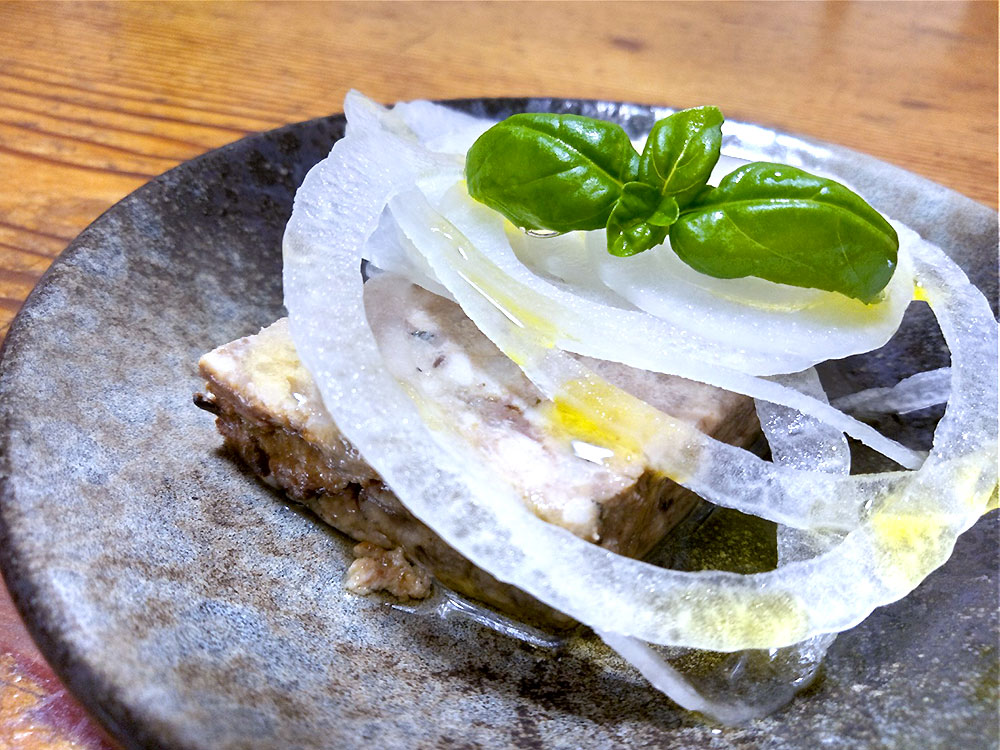 白子産新玉ねぎのスライスの上に、お庭のバジルをのせてみました。