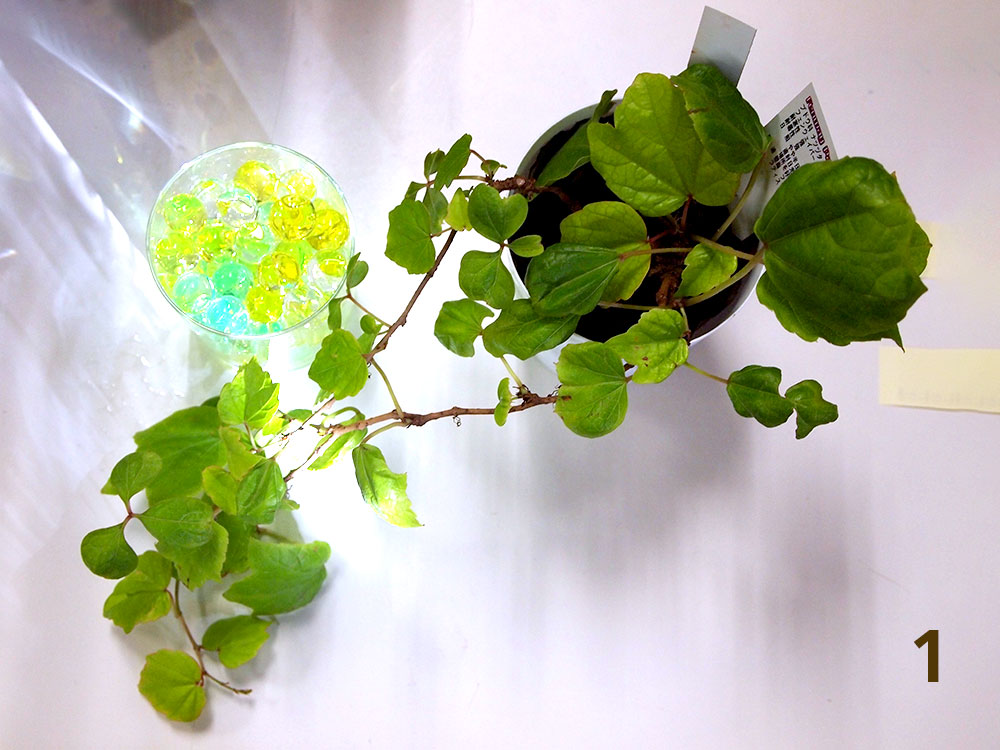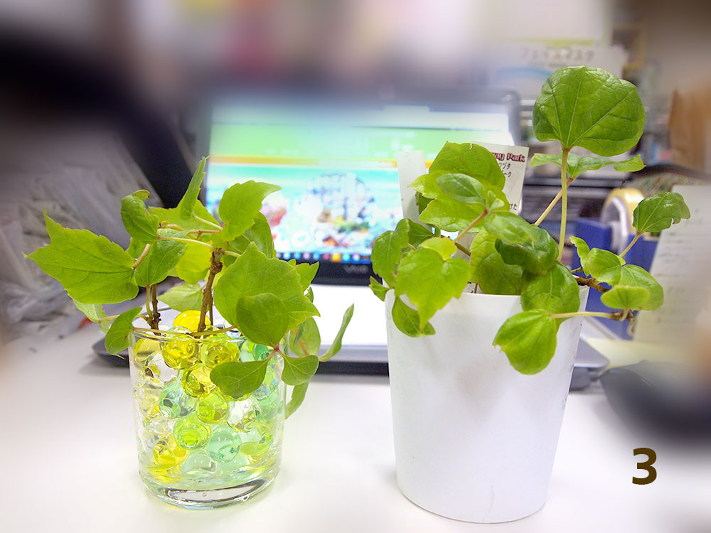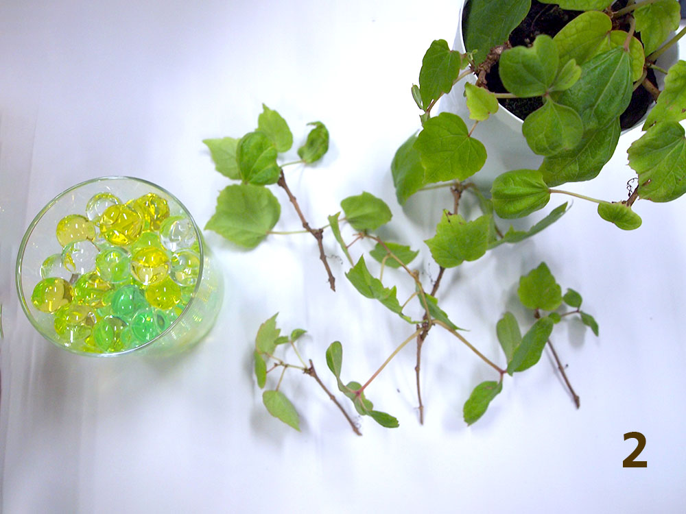 それと、100円ショップで購入したグラスとプラントビーズ。ビーズがたっぷりと水分を含んでいるので、水やりの必要もなし!だそう。心強いです。 - 長く伸びているツルをいくつかカット。3節ぐらいの長さで5本を刺し穂として取りました。