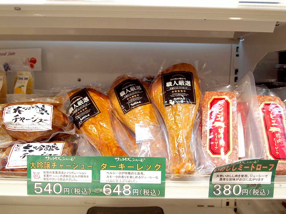 サンライズファームさんのジビエ「いのししミートローフ」や「ターキーレッグ」、今サンライズファームさんイチオシの「大吟醸チャーシュー」があります。