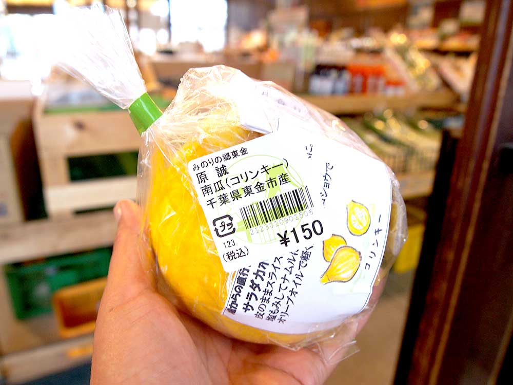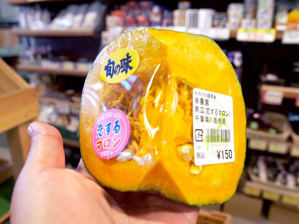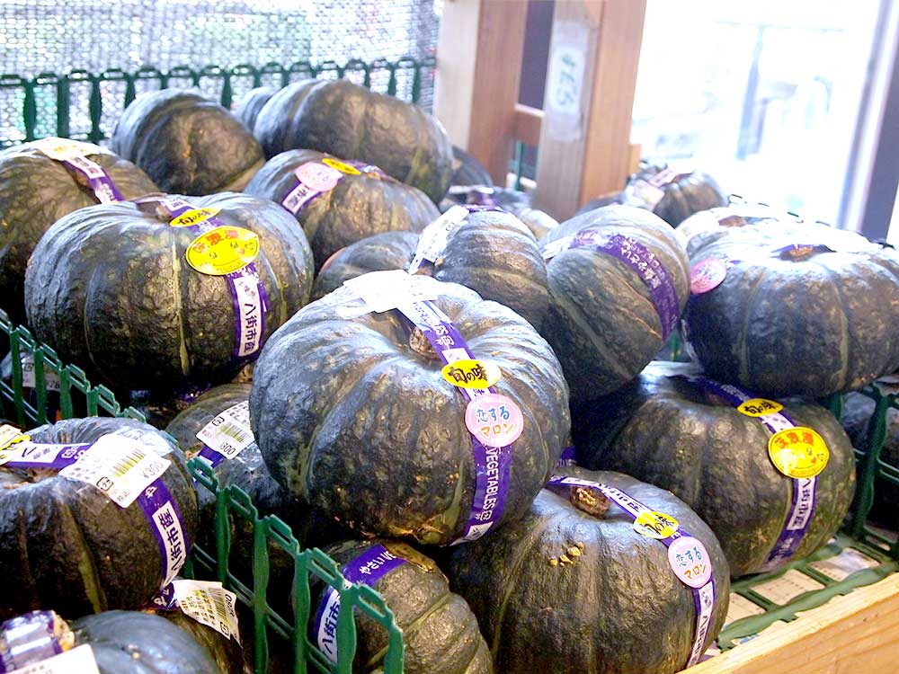 普通のかぼちゃのほか、生でスライスしてバーニャカウダなどでお召し上がりいただく「コリンキー」カボチャやそうめんカボチャも並んでいます。
