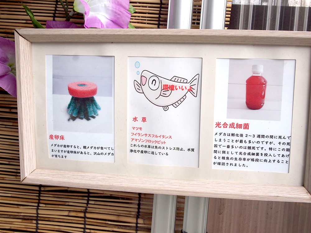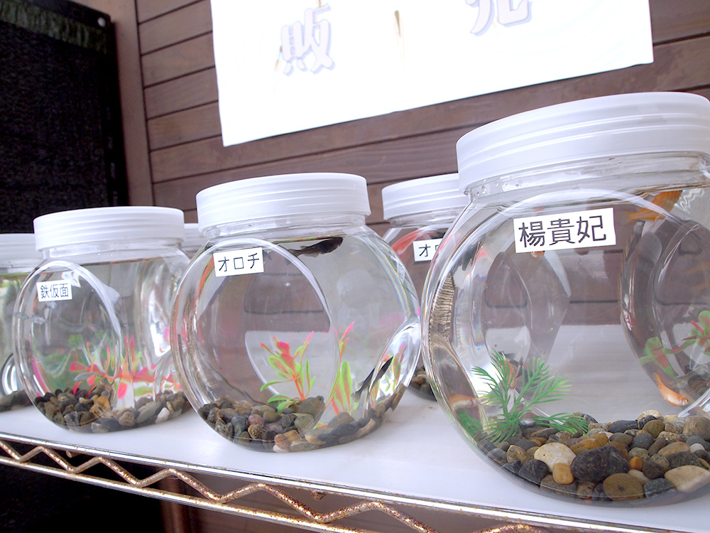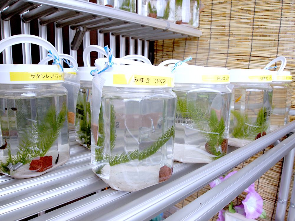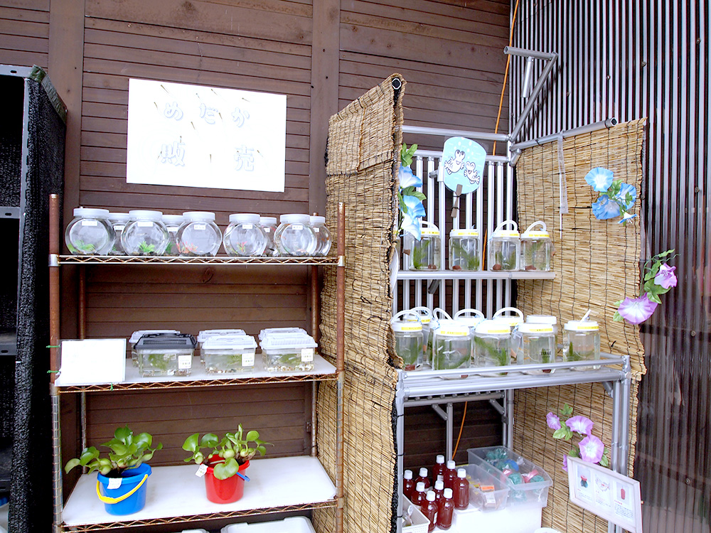 涼し気に演出された「めだか」売り場、出荷者さんが飾ってくださったみたいで素敵です。