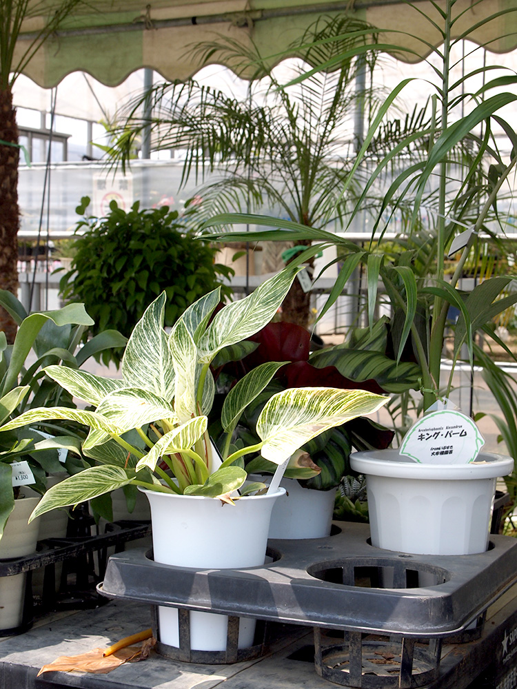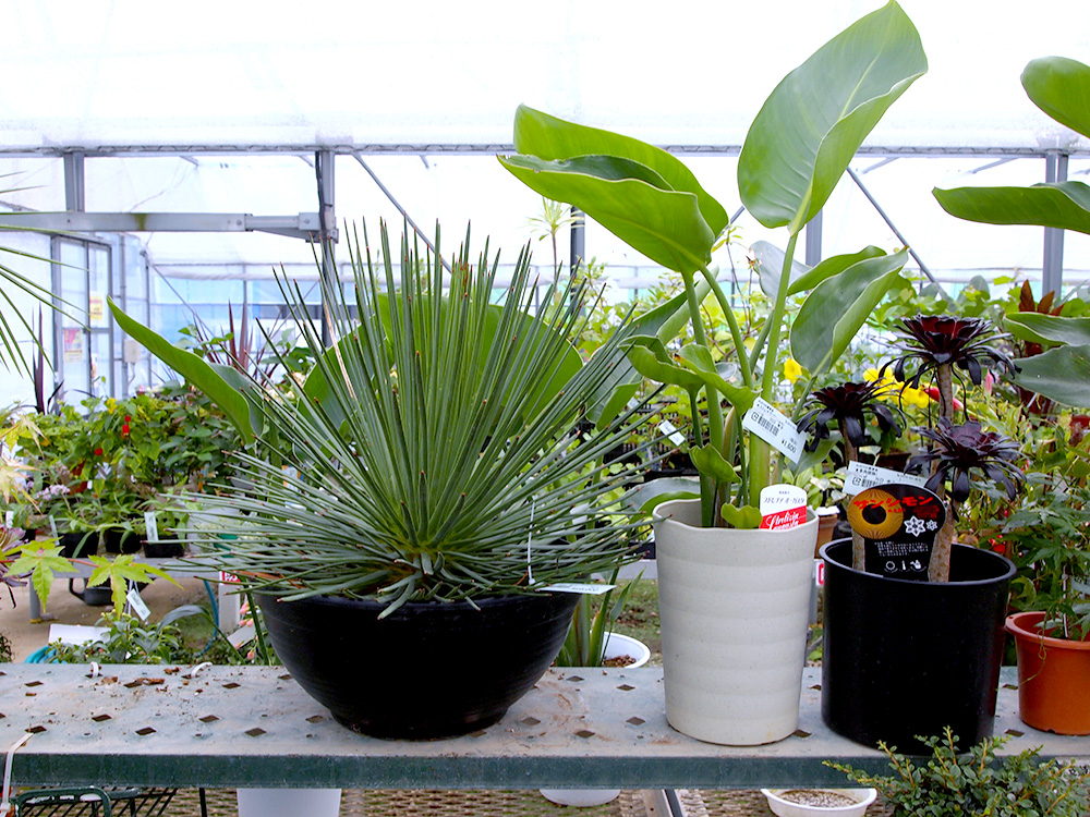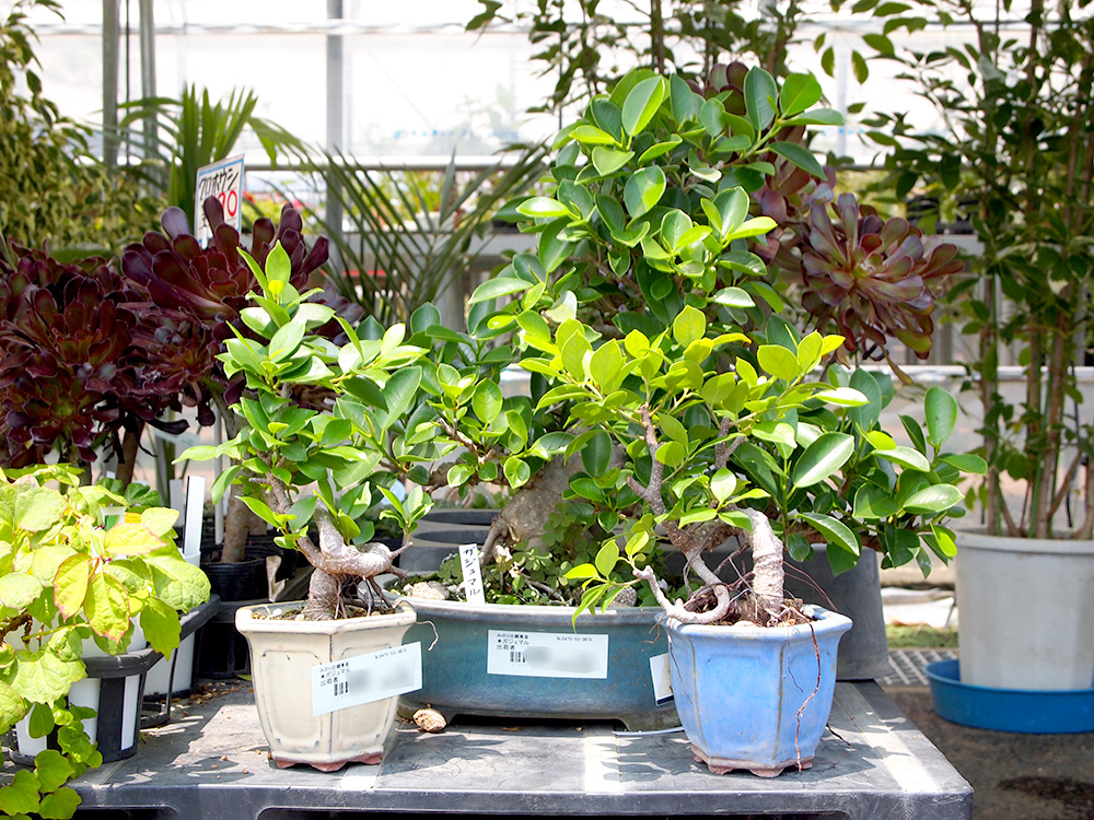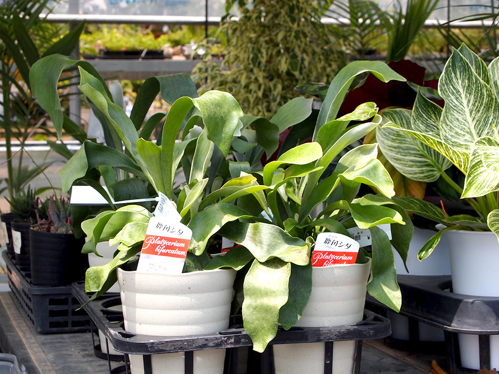 夏っぽい「鹿角シダ(ビカクシダ)」や斑入りの大きな葉が美しい希少種の「フィロデンドロン・バーキン」、盆栽仕立てで立派な「ガジュマル」もこちらにございます。