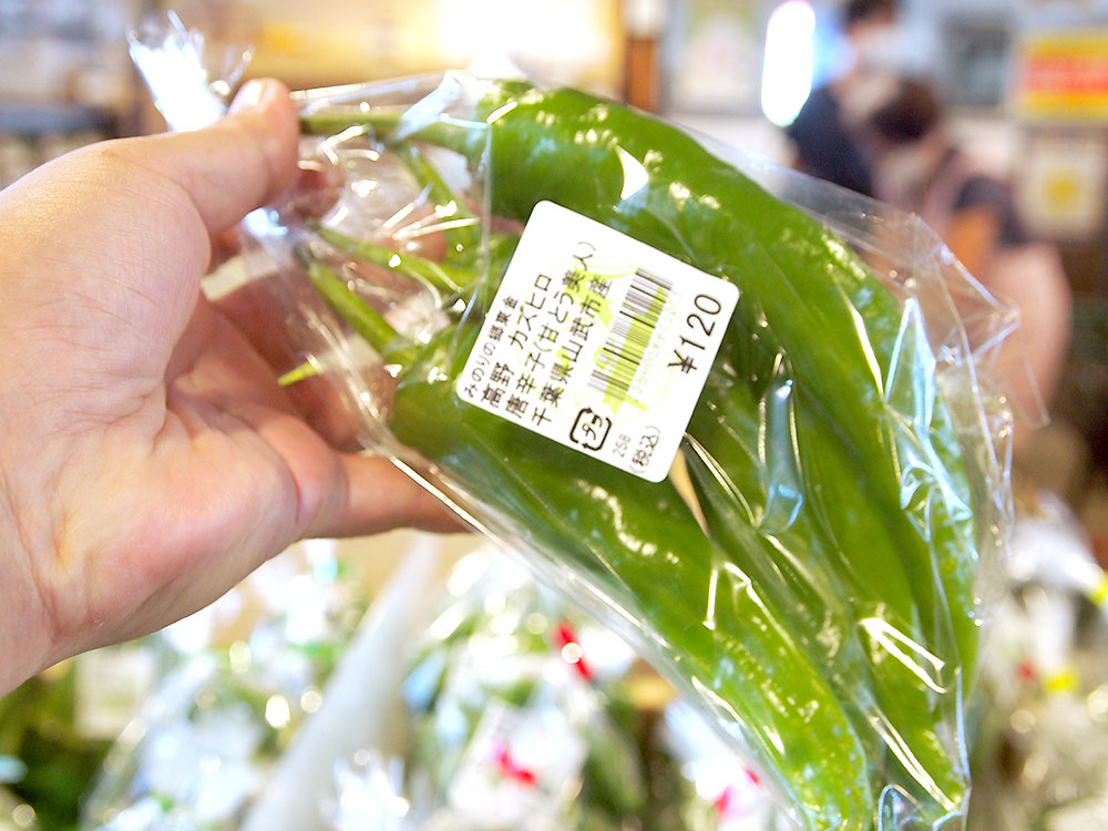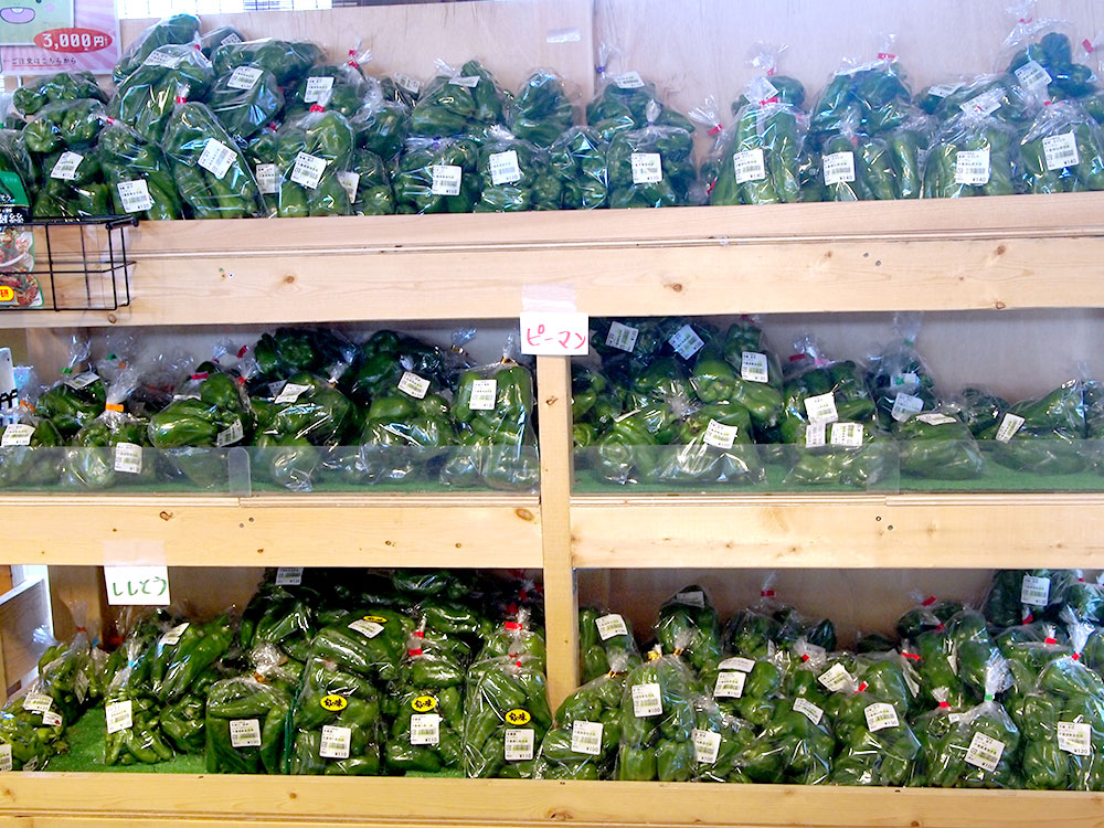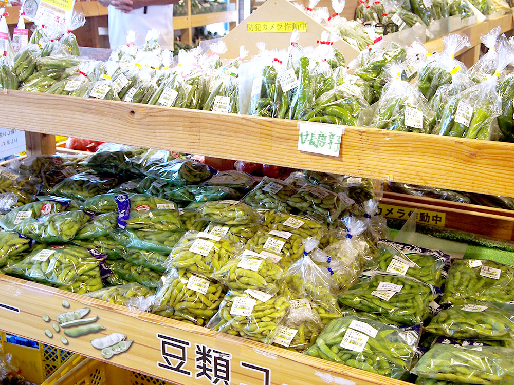 枝豆「湯あがり娘」もいっぱい!その上の段には甘唐辛子がたくさん並んでいます。「焼びたし」「揚げびたし」などで食べるとおいしそうです。