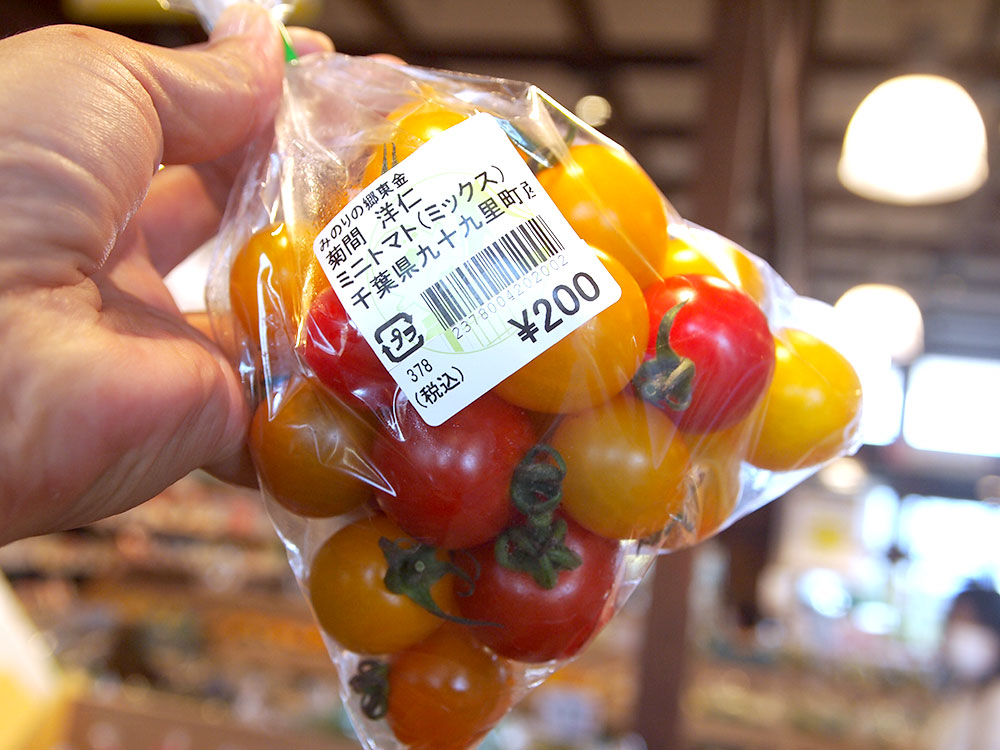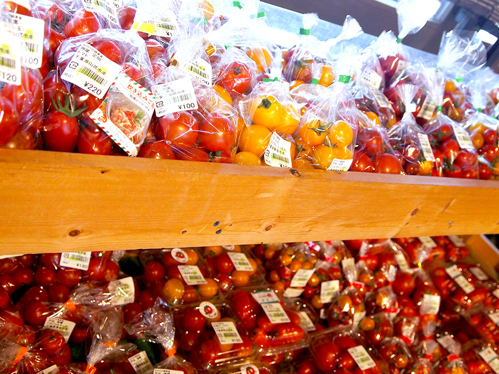 プチトマトのコーナーもてんこ盛り!トマトの色が赤一色でなく、黄色とミックスのものが多く並んでいておいしい色どりですね!