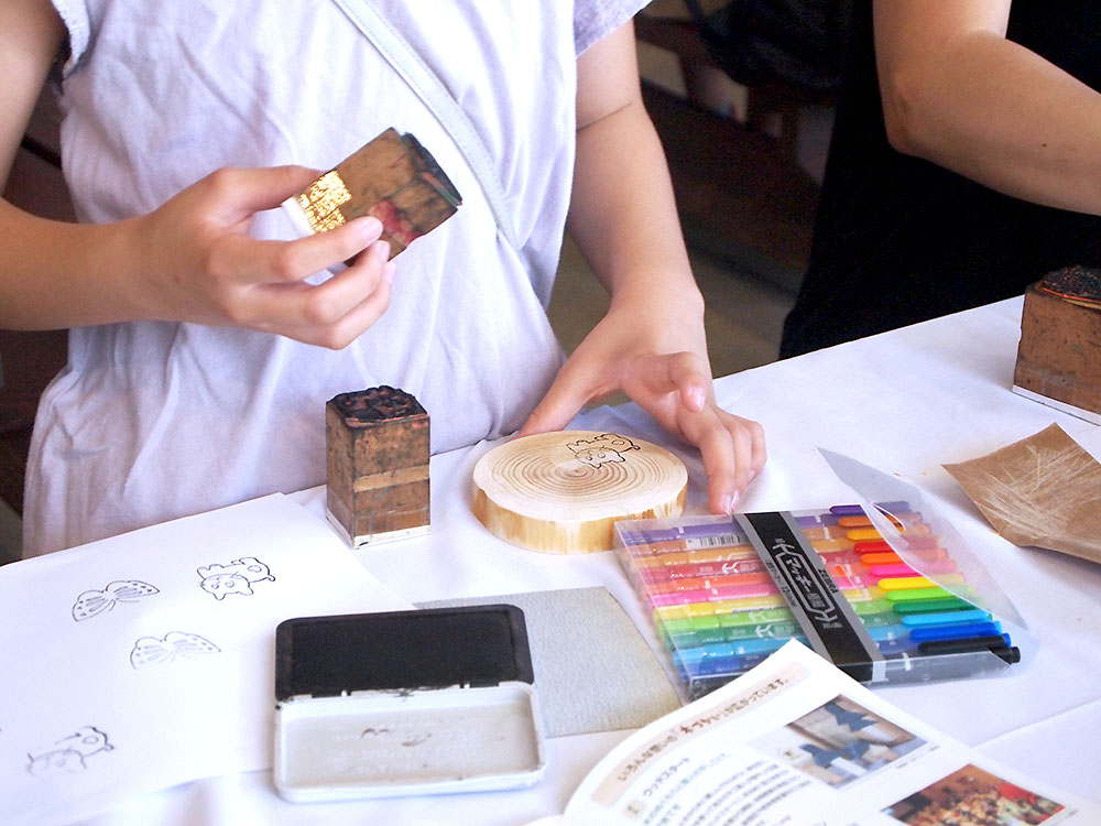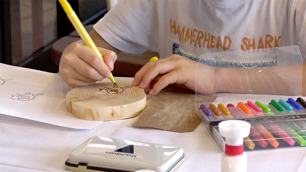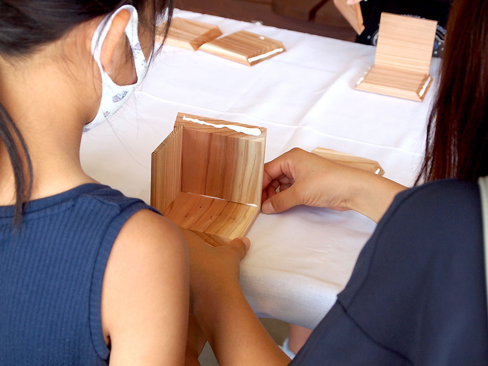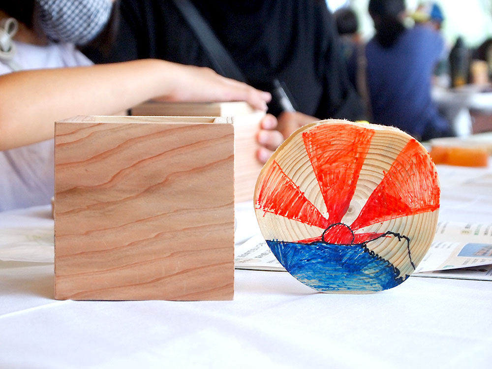 サンブスギの箱が作れるキットを組み立てたり、サンブスギのコースターにスタンプを押したり、好きな絵をを書いて作品を作りました。