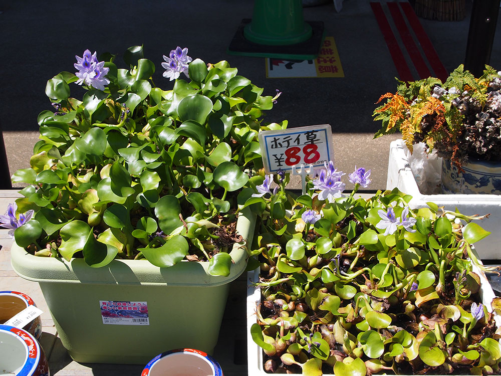 初夏から並んでいて人気の水草「ホテイ草」の花が咲き始めています。