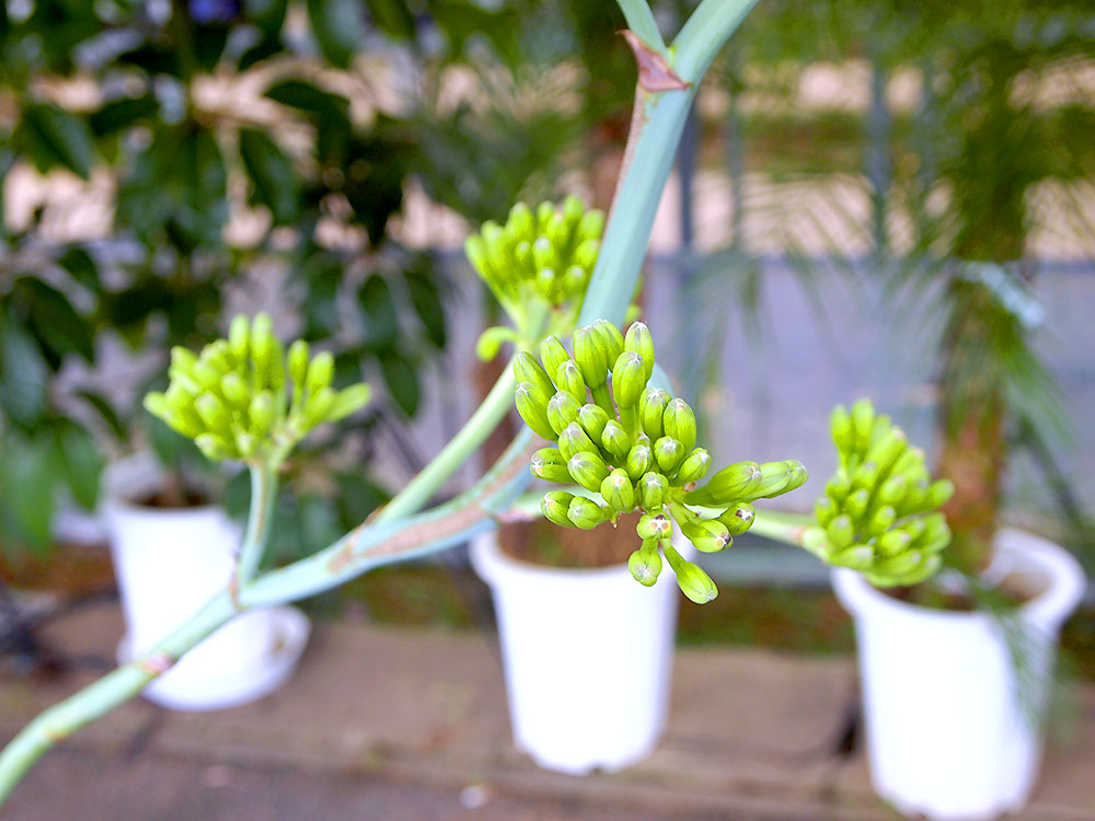 やっと焦点があった!アガベの神の花の花蕾、大きめのフィロデンドロン・セロームなどなどがお楽しみいただけます。