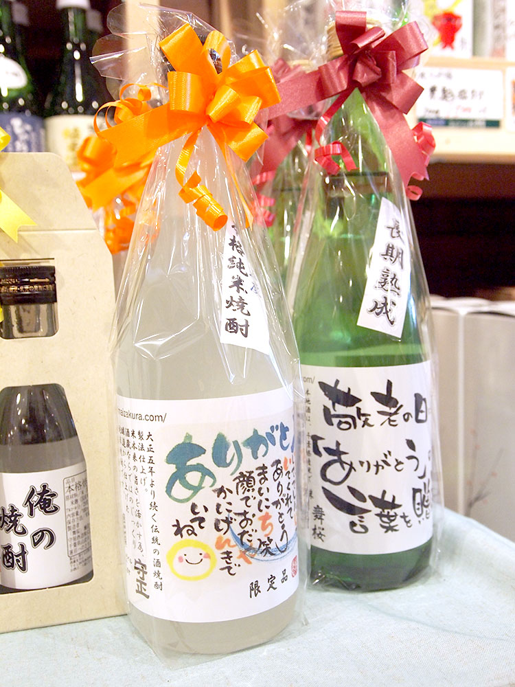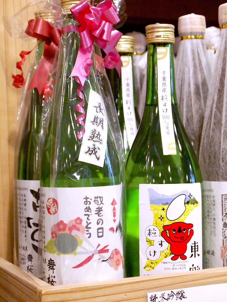 東金マルシェレジ前のお酒コーナーには、敬老の日のお祝いにピッタリな地酒パッケージが並んでいます。