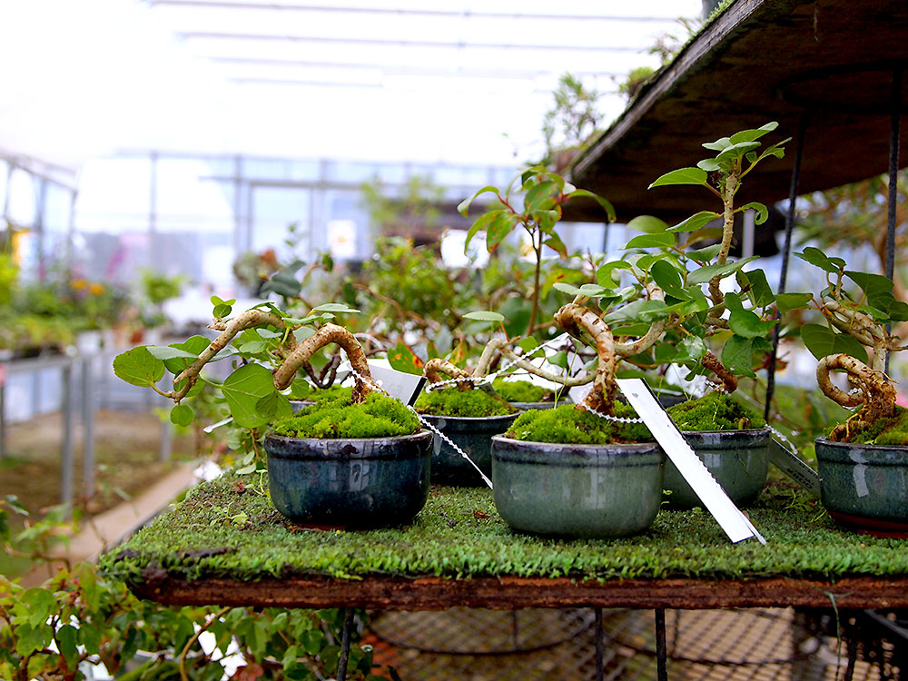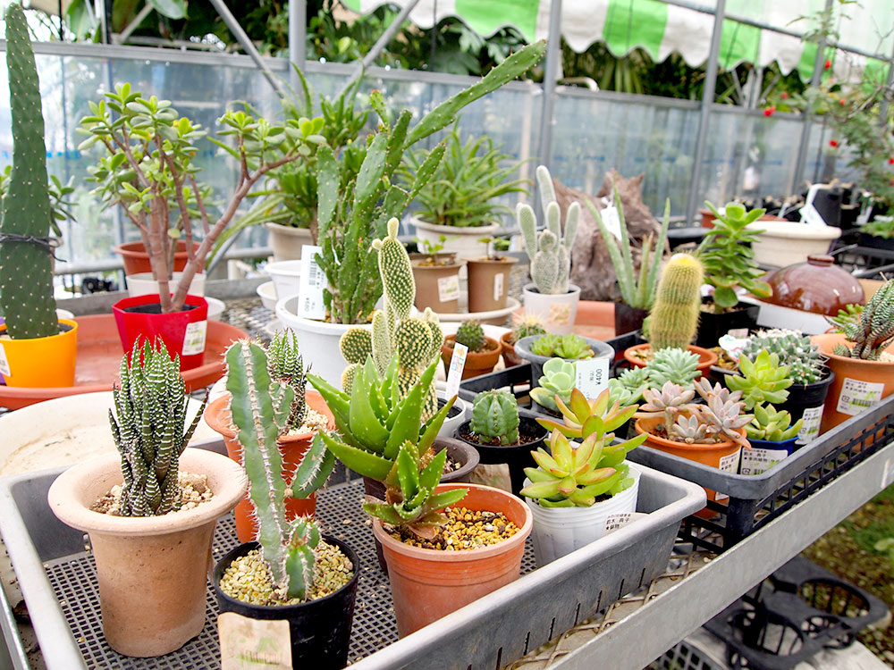手のリサイズのマイクロ盆栽や、小さなサボテンなどの多肉植物がいっぱい!