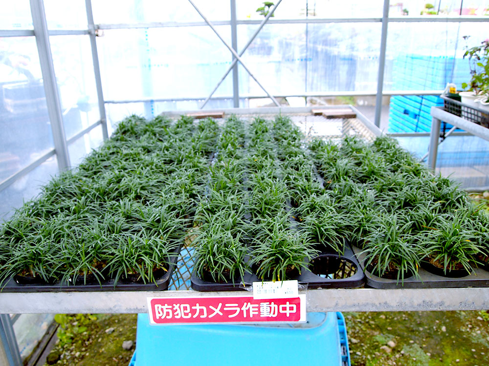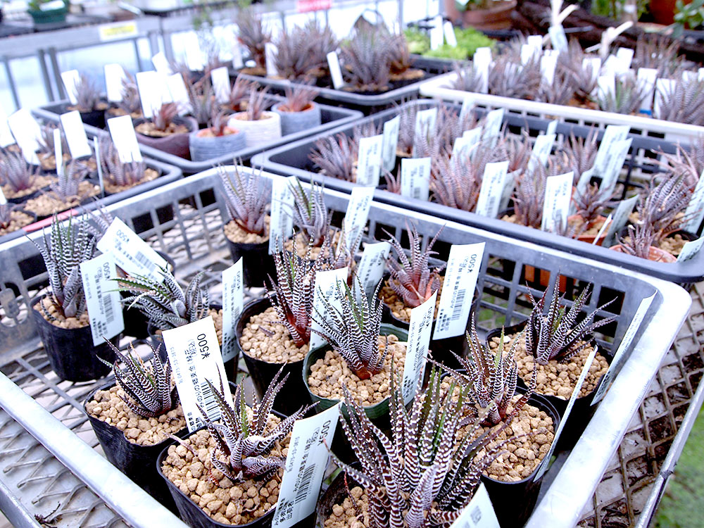 パイプハウス左側の入り口では、グランドカバーの玉竜(タマリュウ)や、今だけの特価品!ハオルチア 十二の巻がズラリ!