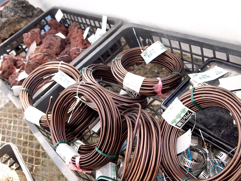 盆栽の曲げに使用するアルミ線、雰囲気のある石や木でできた器類、土の表面を覆ったり、土の代わりにくるんだりする苔、土の表面を美しく覆う飾り石などがあります。