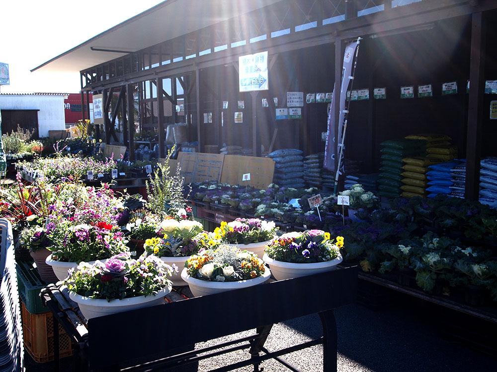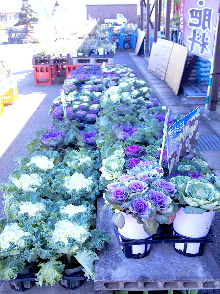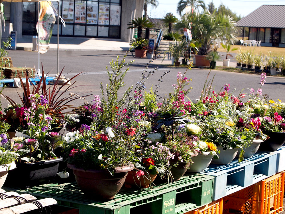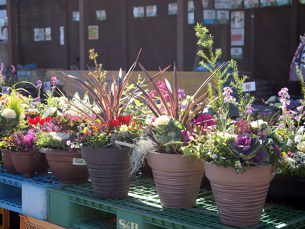 道の駅 みのりの郷 東金 緑花木市場には、お正月を彩る寄せ植えがたくさん並び始めました。