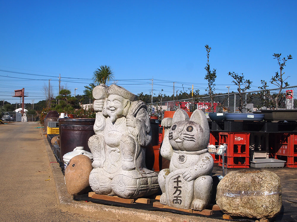 緑花木市場の骨とう品売り場では、猫が招いています。