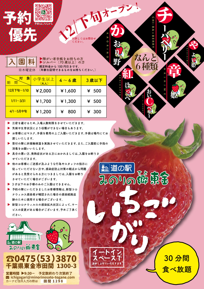 道の駅 みのりの郷 東金では、東金観光苺組合さんのご協力で「みのりの郷 東金いちご狩り」を今年は「新しい『いちご狩り』様式」で2021年12月下旬よりオープンします!(ゴールデンウィークごろまで)