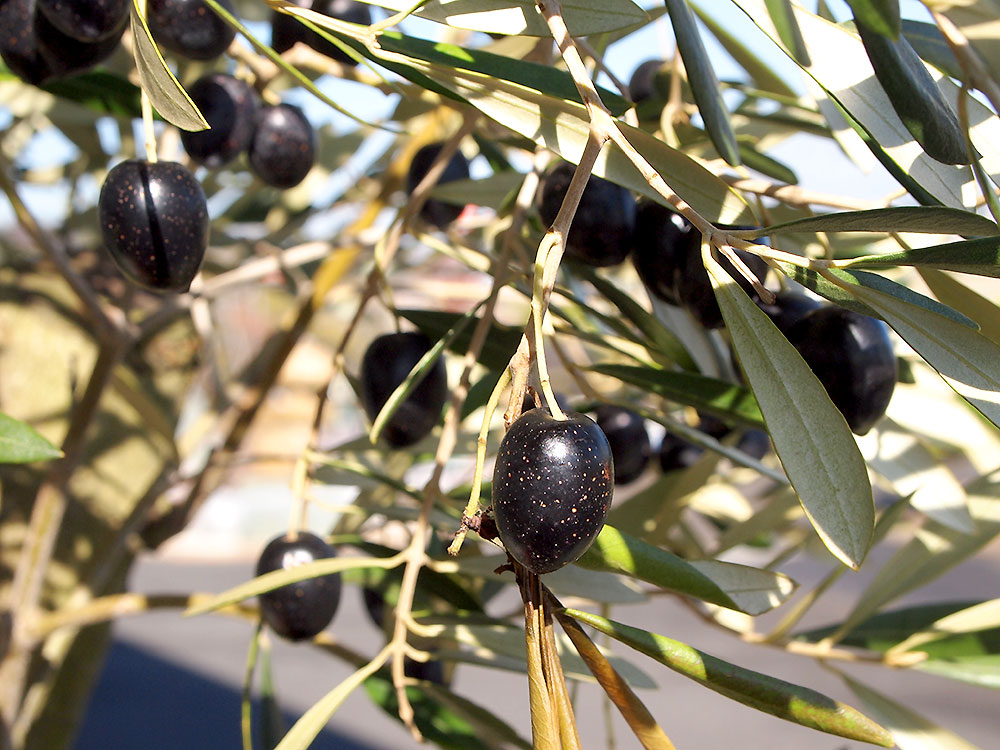 テラス席の隅のほうに、以前は国道126号沿いにありましたが、オリーブアナアキゾウムシの被害にあったため強剪定をして切り詰めて、鉢上げをして養生をしていたオリーブの木にオリーブ果実がたくさんぶら下がっていました。