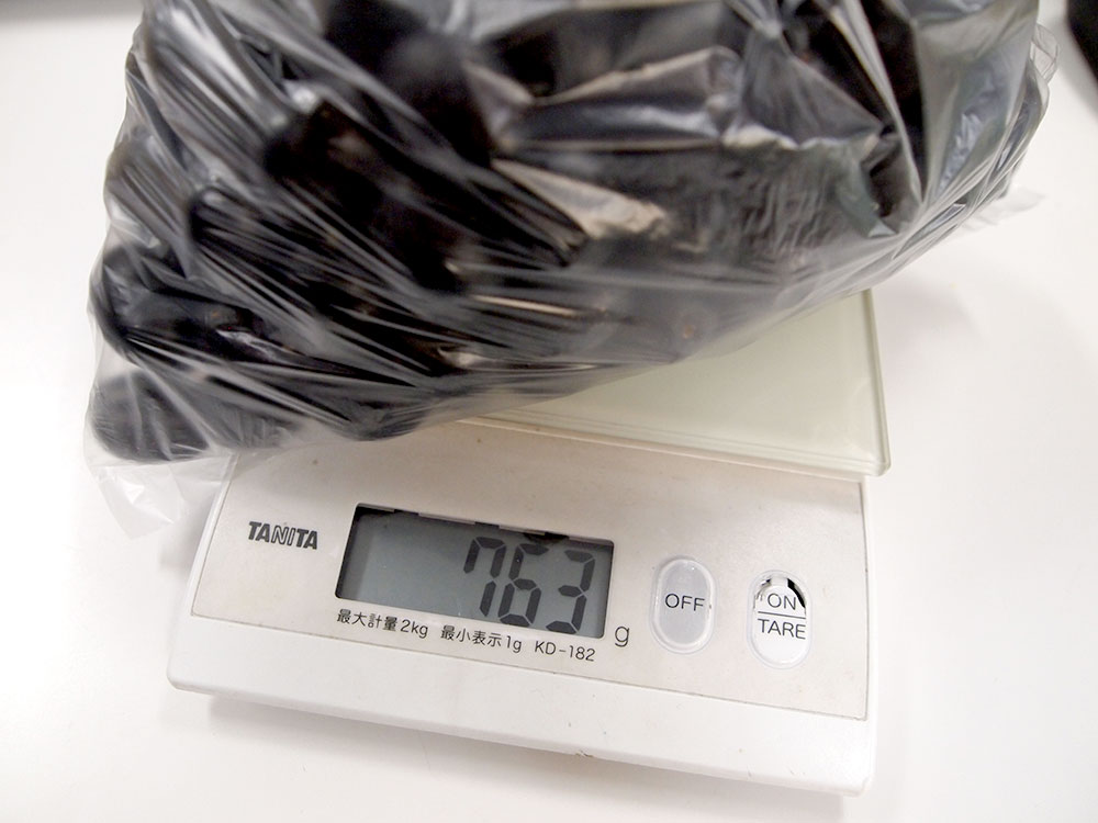 一部水分が抜けてシワシワになっていた果実は収穫をせず、収穫をして袋に入れてきたブラックオリーブの重量は763gでした。