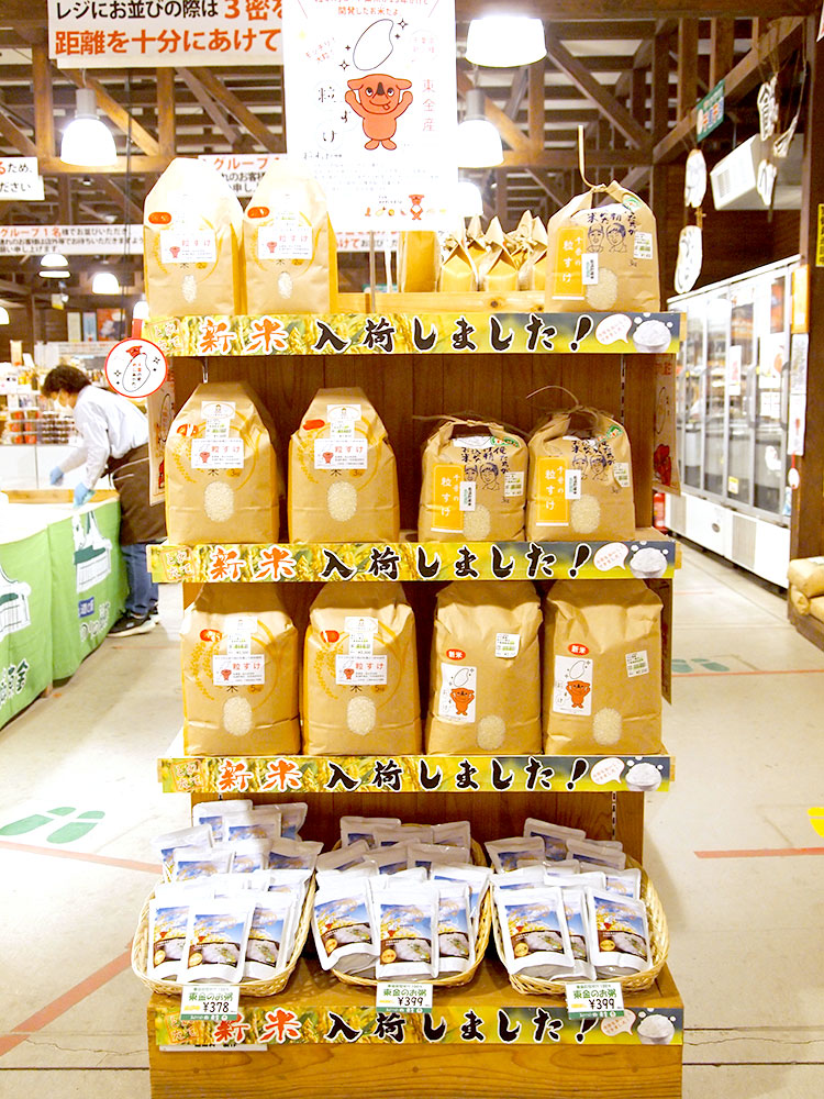 道の駅 みのりの郷 東金 東金マルシェの新米特設『粒すけ』コーナー棚では、今年収穫された東金市産『粒すけ』新米で作ったレトルトパウチのお粥を絶賛販売中!です。