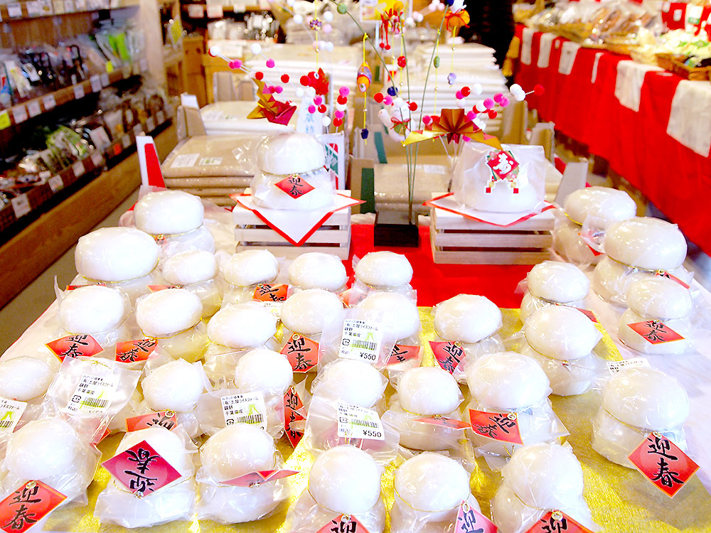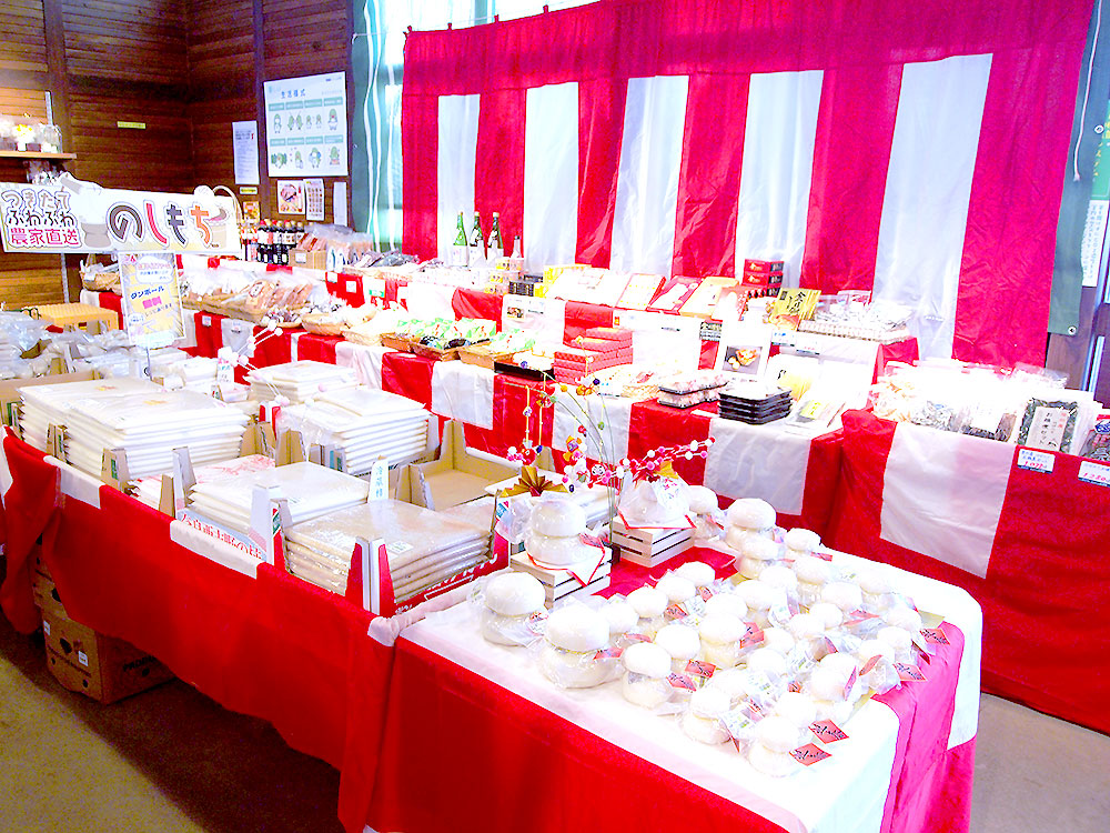 東金マルシェを入ってすぐ右側のコーナーに、農家さん直送!つきたてののし餅やかわいらしい鏡餅、はばのりやお豆等々お正月の縁起物食材をズラリ!とまとめました!